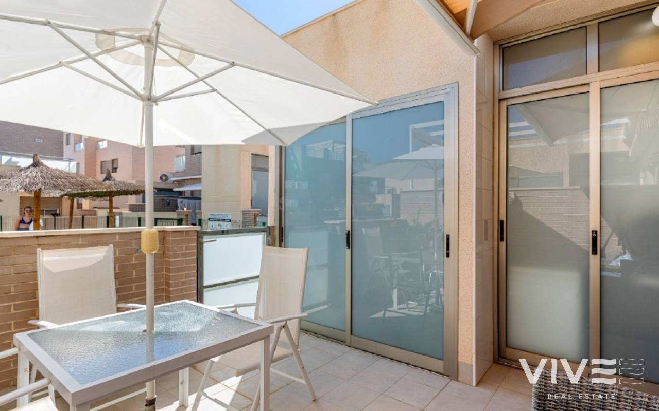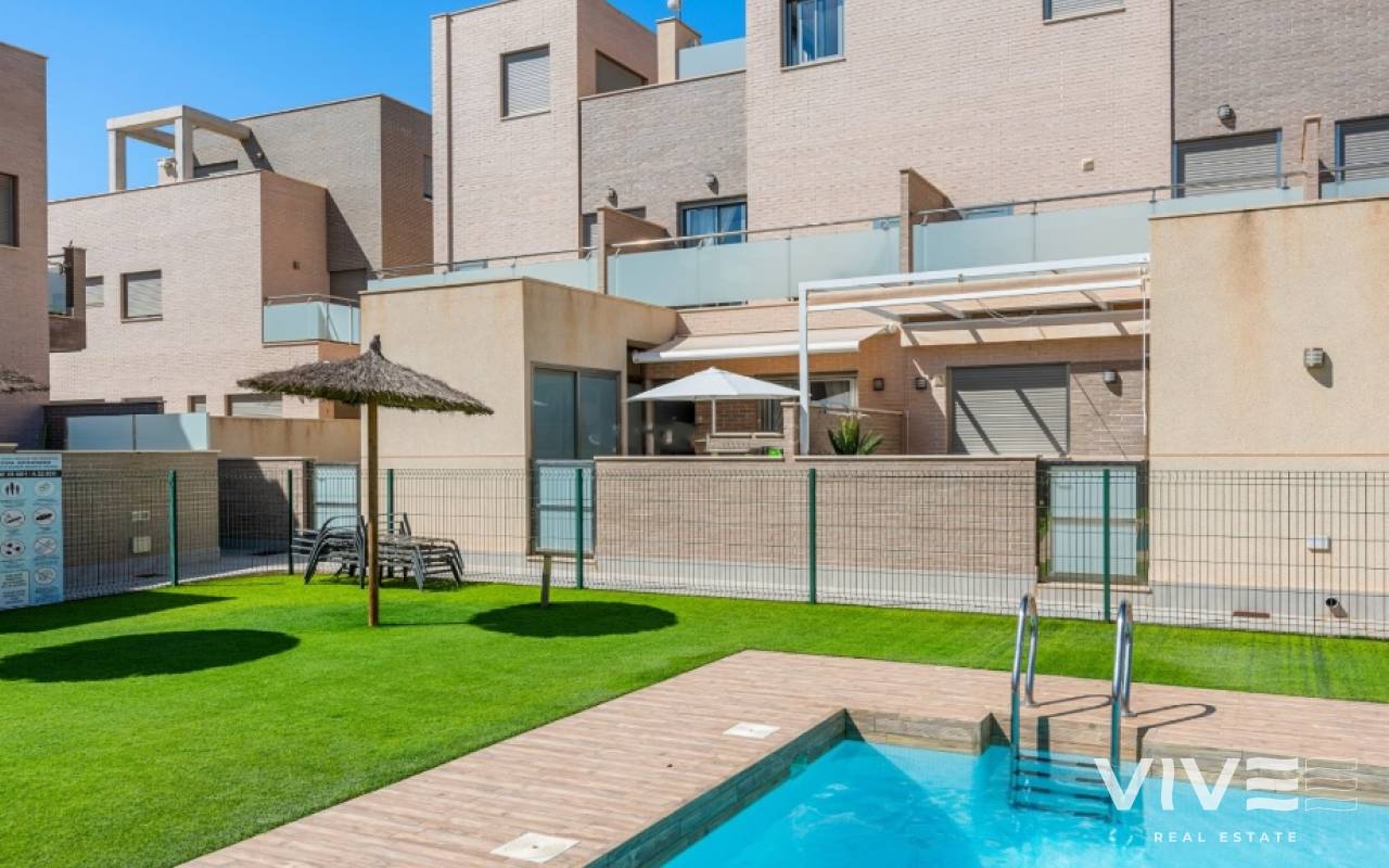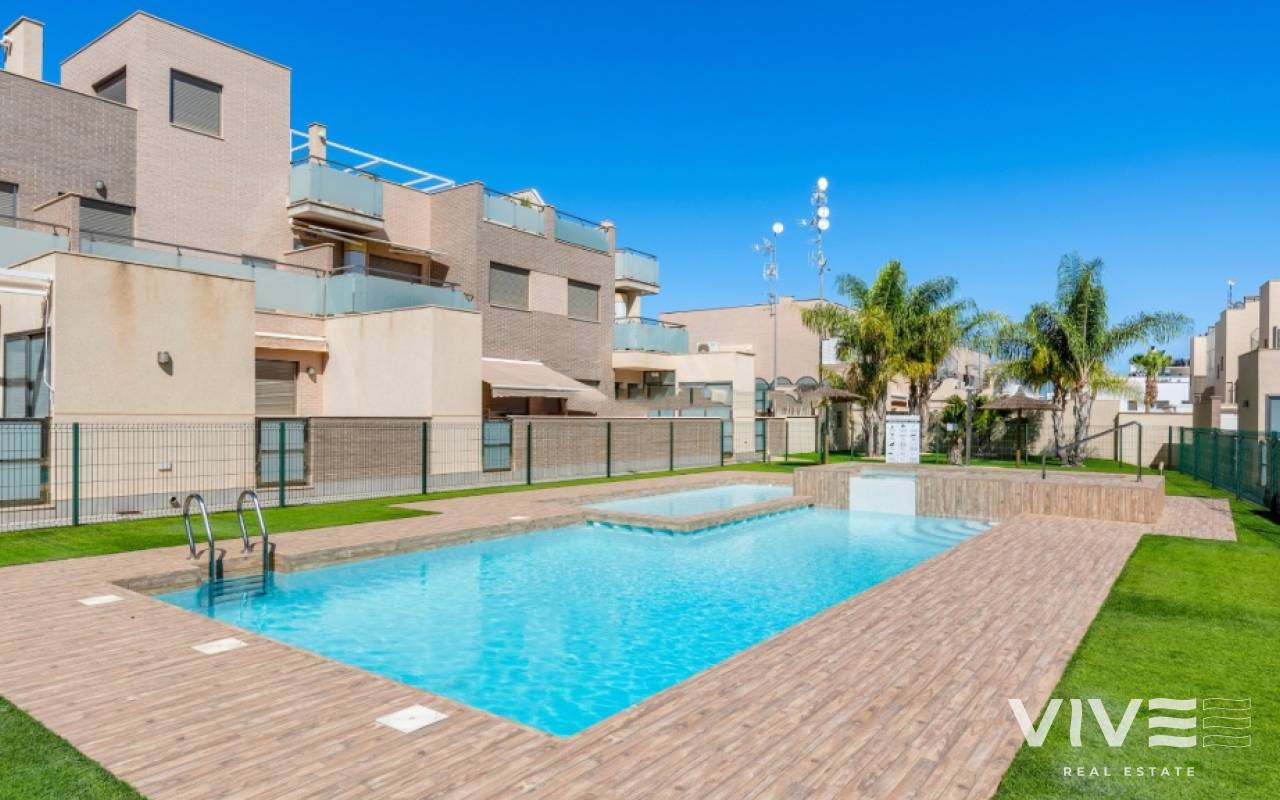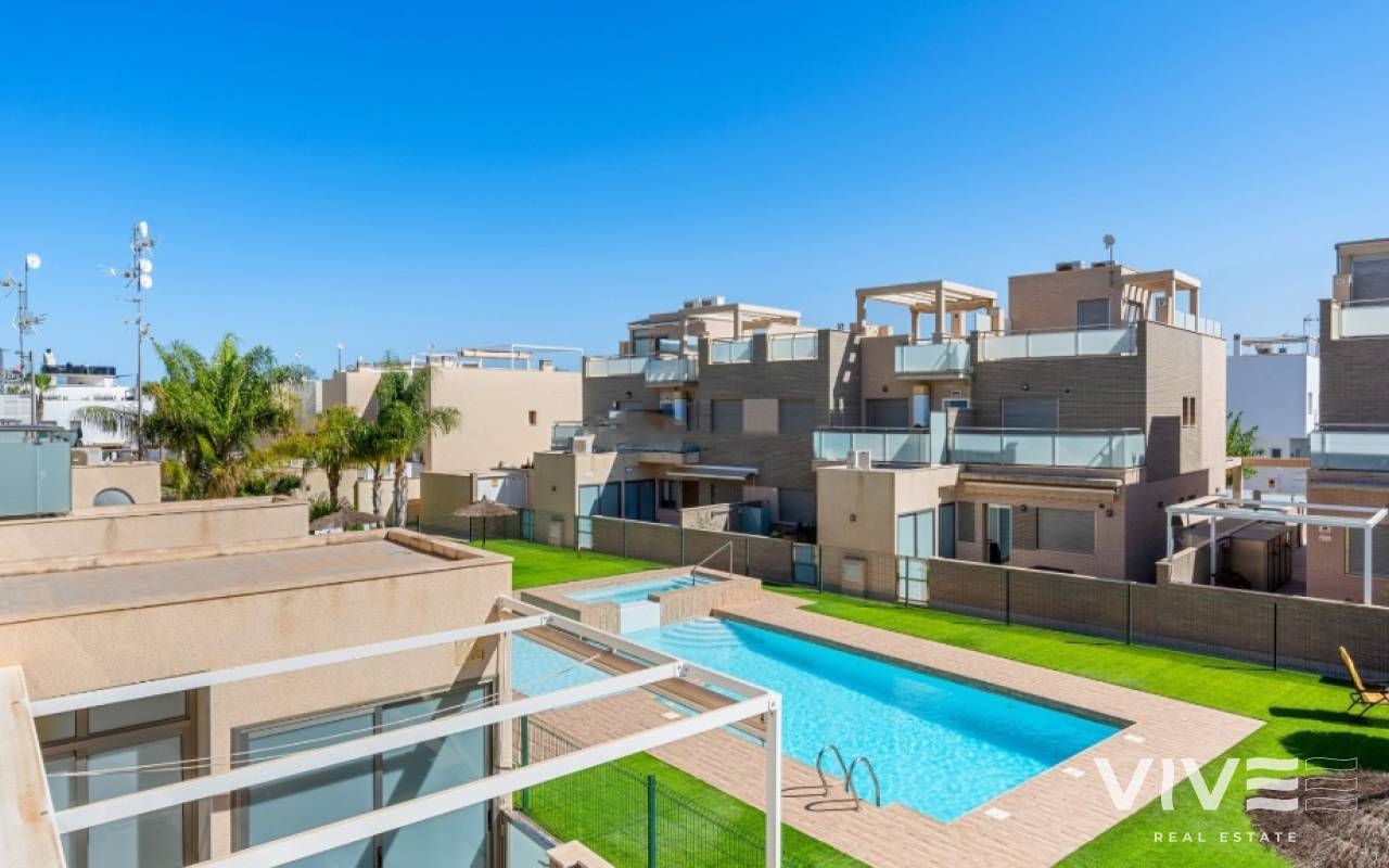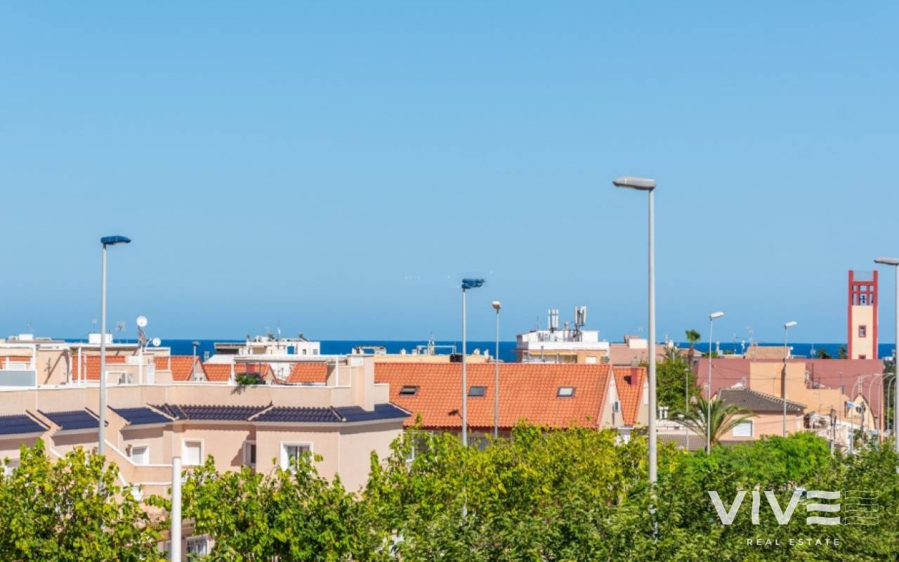 For sale townhouse in Torre de la Horadada, Alicante. This modern, stylishly decorated three-story townhouse has 3 bedrooms, 3 bathrooms, open plan modern kitchen, 2 terraces where you can enjoy the sun and the roof terrace/solarium with sea views.Small gated community with pool and underground parking is situated only 300m from the sandy beach.The Torre de la Horadada is a beach town in the Mediterranean Sea that is located in Alicante and belongs to the municipality of Pilar de la Horadada. However, it is very close to the Region of Murcia, right next to the beaches of the Mar Menor. It takes less time to arrive by car than it takes to go to other beaches in the Region of Murcia.The coastline of Pilar de la Horadada extends over more than four kilometers, in which we find different environments. There are extensive beaches of fine white sand in intense contrast with the blue sea and small rocky barrels, which enter the sea and hide coves of golden sand.The purity of the beaches that Pilar de la Horadada has earned the Blue Flag of the F.E.E.E. and the continuous recognition of the water quality service of the Ministry of Environment. A guarantee to enjoy a healthy environment.