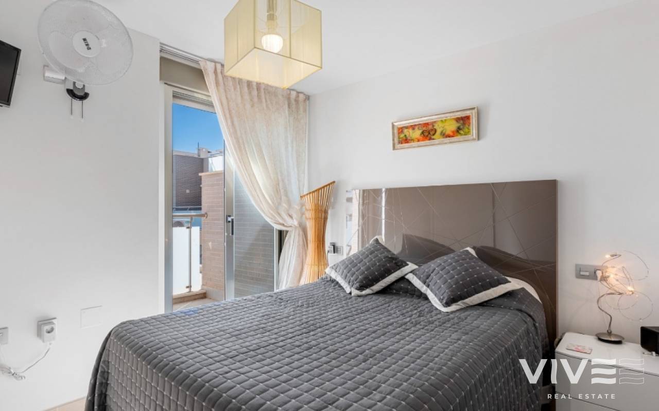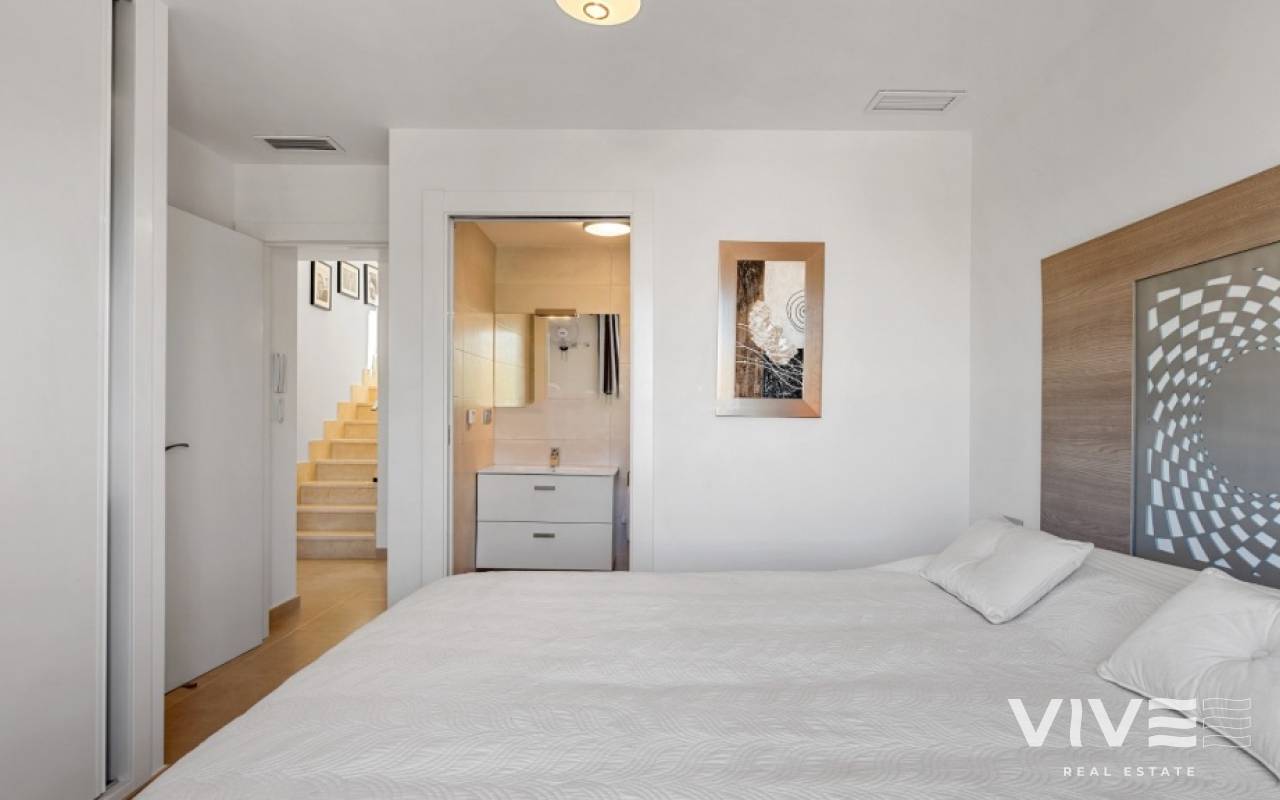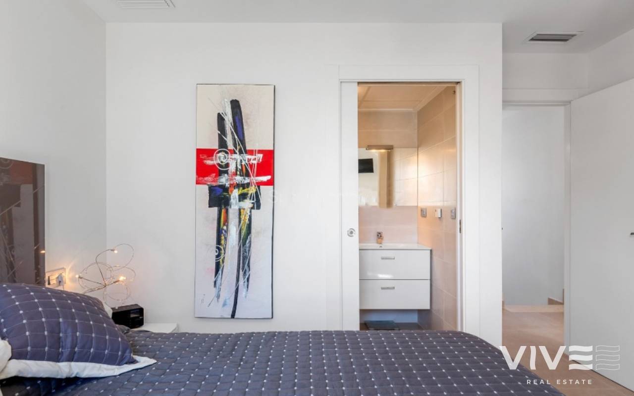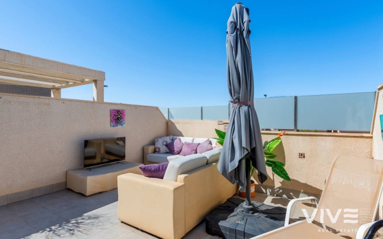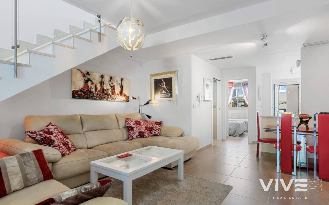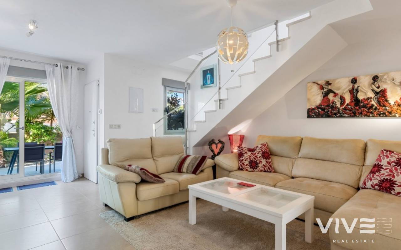 For sale townhouse in Torre de la Horadada, Alicante. This modern, stylishly decorated three-story townhouse has 3 bedrooms, 3 bathrooms, open plan modern kitchen, 2 terraces where you can enjoy the sun and the roof terrace/solarium with sea views.Small gated community with pool and underground parking is situated only 300m from the sandy beach.The Torre de la Horadada is a beach town in the Mediterranean Sea that is located in Alicante and belongs to the municipality of Pilar de la Horadada. However, it is very close to the Region of Murcia, right next to the beaches of the Mar Menor. It takes less time to arrive by car than it takes to go to other beaches in the Region of Murcia.The coastline of Pilar de la Horadada extends over more than four kilometers, in which we find different environments. There are extensive beaches of fine white sand in intense contrast with the blue sea and small rocky barrels, which enter the sea and hide coves of golden sand.The purity of the beaches that Pilar de la Horadada has earned the Blue Flag of the F.E.E.E. and the continuous recognition of the water quality service of the Ministry of Environment. A guarantee to enjoy a healthy environment.
