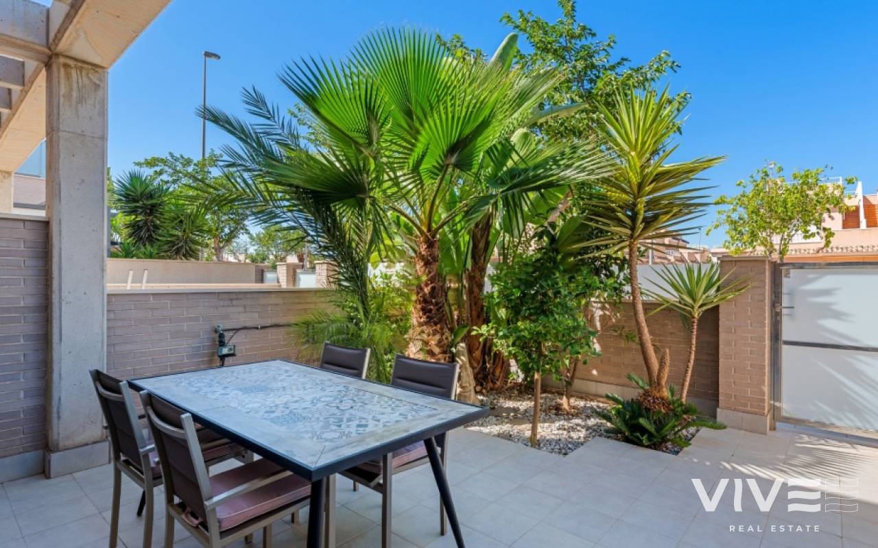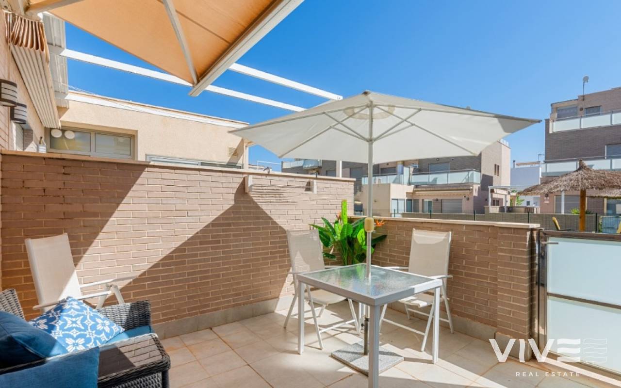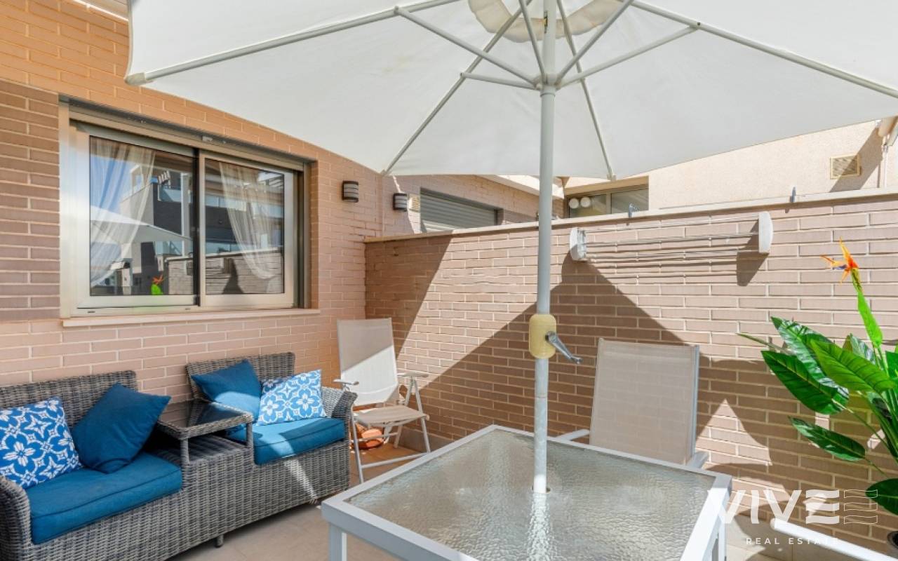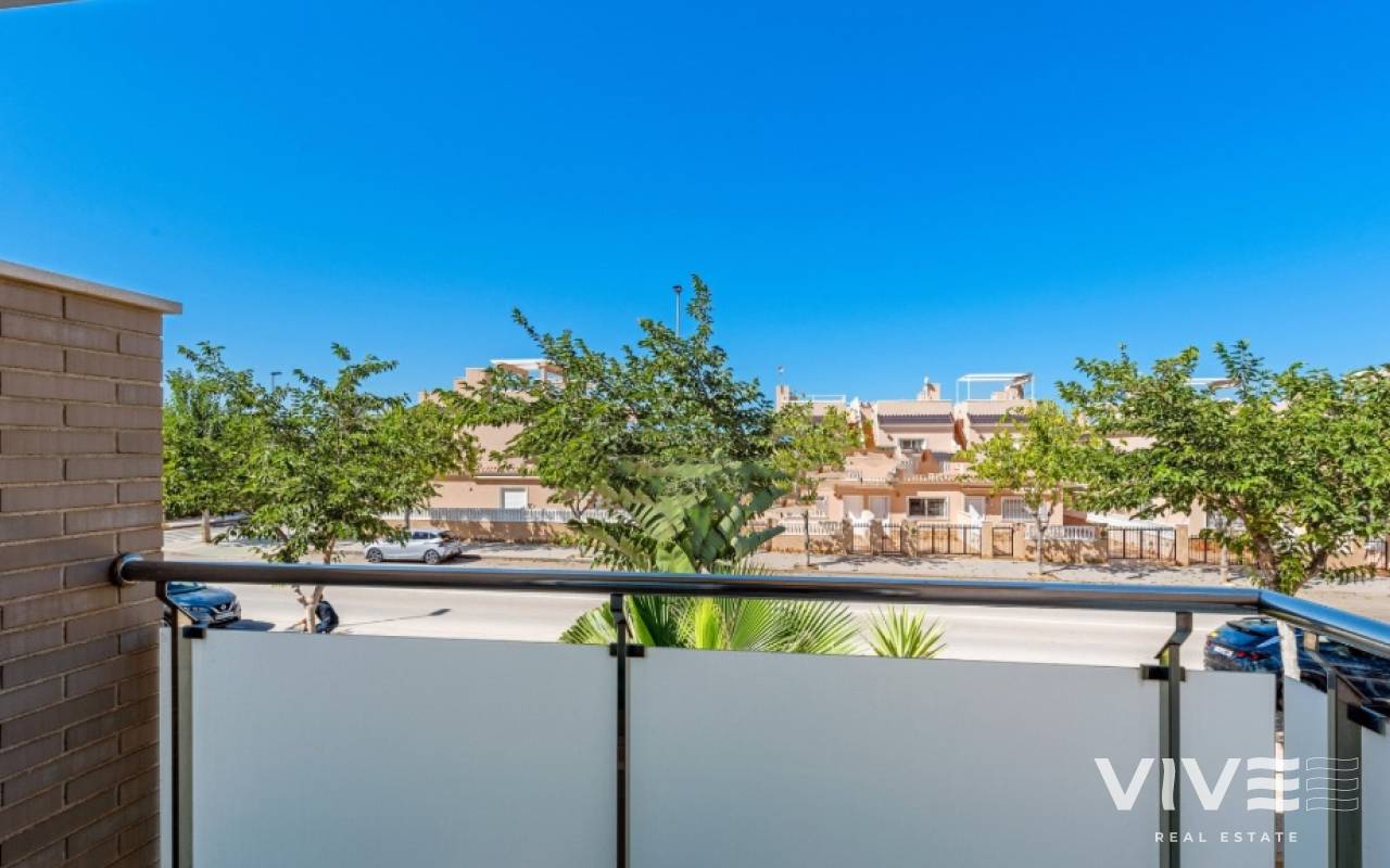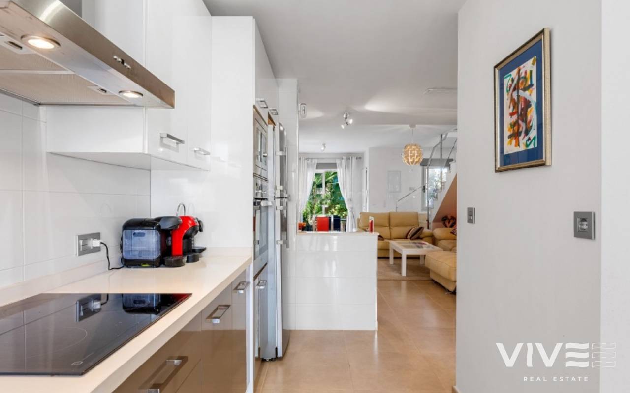 For sale townhouse in Torre de la Horadada, Alicante. This modern, stylishly decorated three-story townhouse has 3 bedrooms, 3 bathrooms, open plan modern kitchen, 2 terraces where you can enjoy the sun and the roof terrace/solarium with sea views.Small gated community with pool and underground parking is situated only 300m from the sandy beach.The Torre de la Horadada is a beach town in the Mediterranean Sea that is located in Alicante and belongs to the municipality of Pilar de la Horadada. However, it is very close to the Region of Murcia, right next to the beaches of the Mar Menor. It takes less time to arrive by car than it takes to go to other beaches in the Region of Murcia.The coastline of Pilar de la Horadada extends over more than four kilometers, in which we find different environments. There are extensive beaches of fine white sand in intense contrast with the blue sea and small rocky barrels, which enter the sea and hide coves of golden sand.The purity of the beaches that Pilar de la Horadada has earned the Blue Flag of the F.E.E.E. and the continuous recognition of the water quality service of the Ministry of Environment. A guarantee to enjoy a healthy environment.