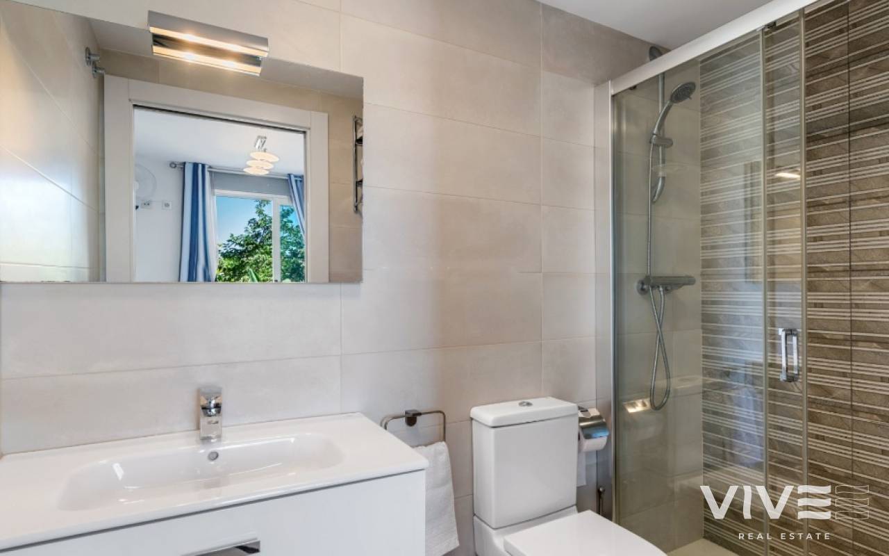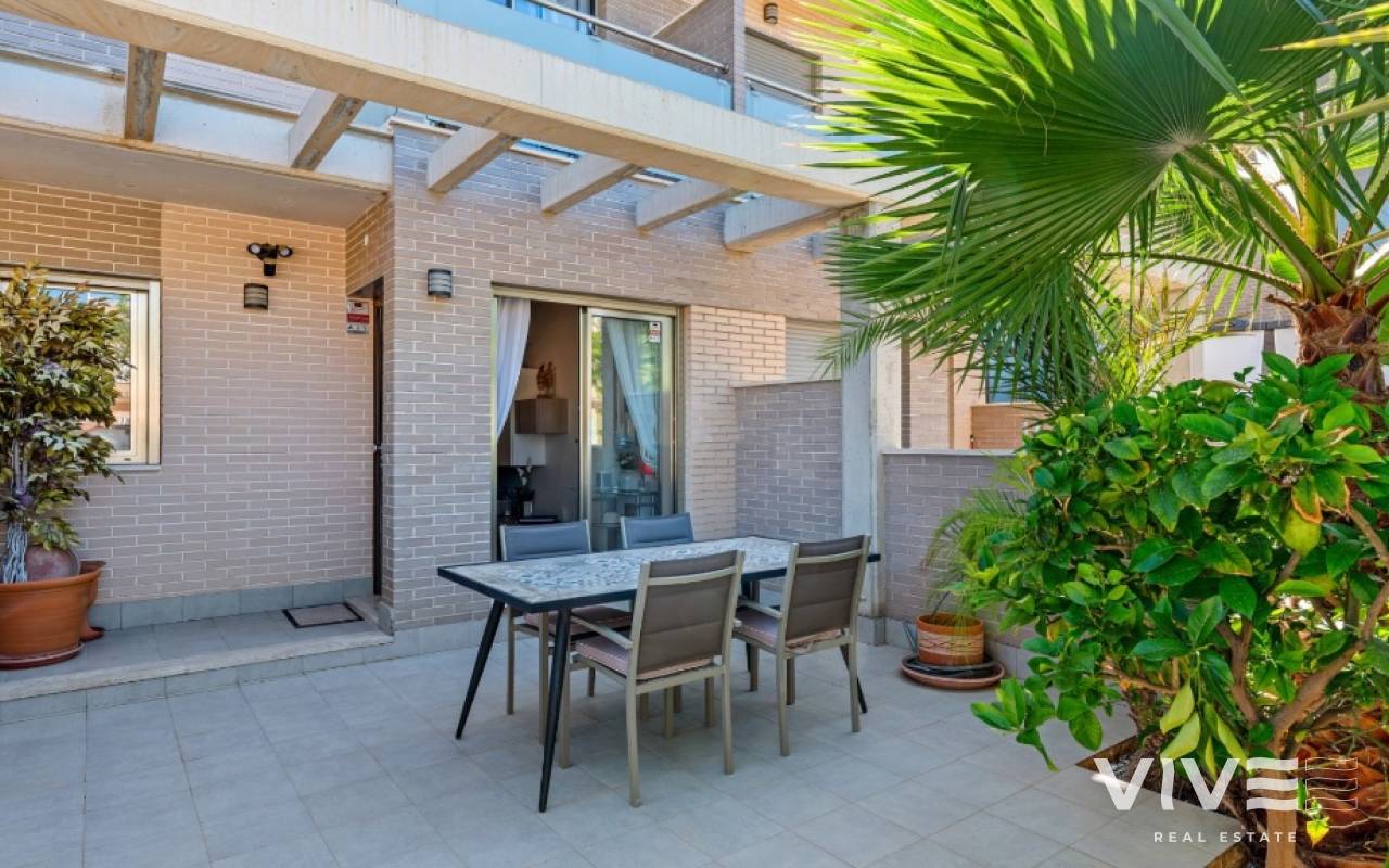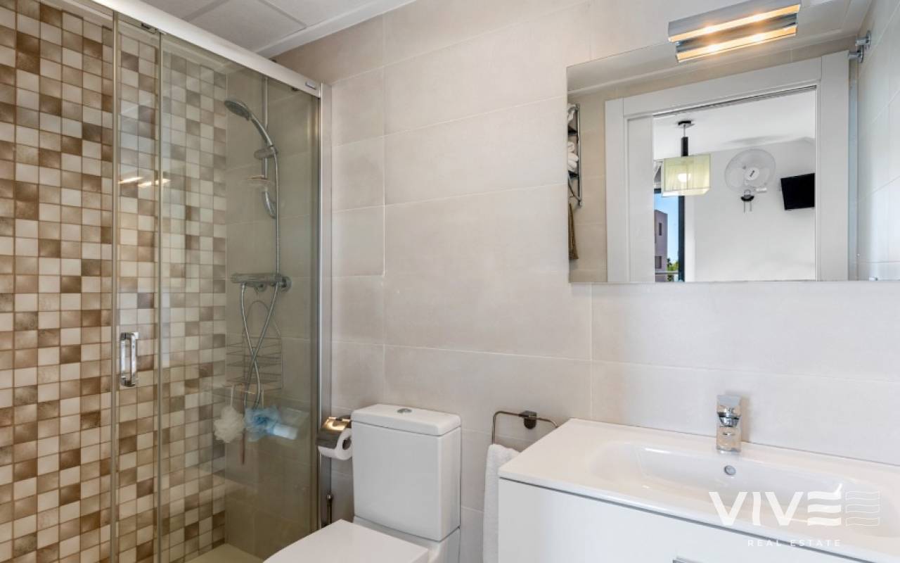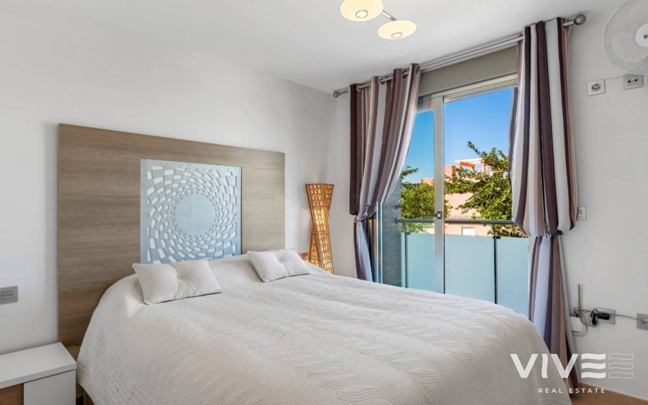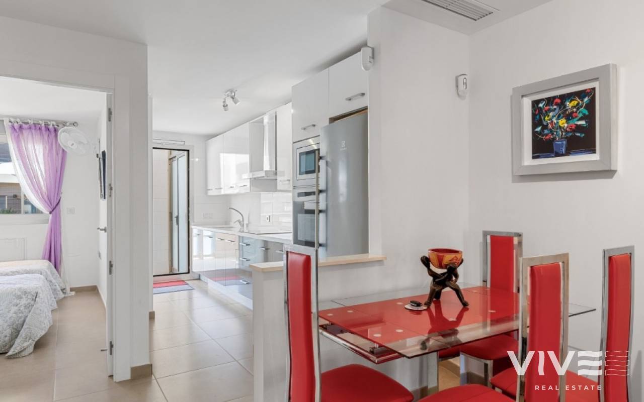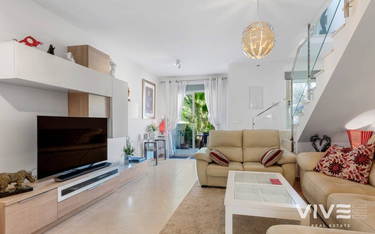 For sale townhouse in Torre de la Horadada, Alicante. This modern, stylishly decorated three-story townhouse has 3 bedrooms, 3 bathrooms, open plan modern kitchen, 2 terraces where you can enjoy the sun and the roof terrace/solarium with sea views.Small gated community with pool and underground parking is situated only 300m from the sandy beach.The Torre de la Horadada is a beach town in the Mediterranean Sea that is located in Alicante and belongs to the municipality of Pilar de la Horadada. However, it is very close to the Region of Murcia, right next to the beaches of the Mar Menor. It takes less time to arrive by car than it takes to go to other beaches in the Region of Murcia.The coastline of Pilar de la Horadada extends over more than four kilometers, in which we find different environments. There are extensive beaches of fine white sand in intense contrast with the blue sea and small rocky barrels, which enter the sea and hide coves of golden sand.The purity of the beaches that Pilar de la Horadada has earned the Blue Flag of the F.E.E.E. and the continuous recognition of the water quality service of the Ministry of Environment. A guarantee to enjoy a healthy environment.