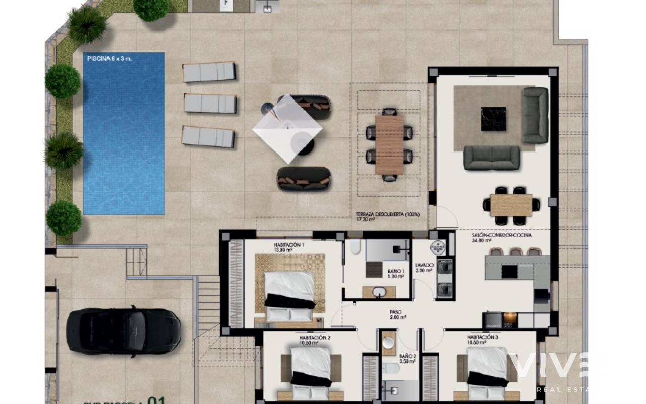 New villa for sale in Rojales.One level new villa built to the hight standard equipped with 3 bedrooms, 2 bathrooms, living room, spacious kitchen and private pool. Optional: solarium.Rojales is a modern town, located on the southern Costa Blanca, just 8 km north of the major town of Torrevieja and with both Alicante and Murcia airports just 30 minutes' drive away and 40 minutes to San Javier.Rojales also boasts a great choice of pubs and restaurants, the Aqua Splash water park and two golf courses, La Finca Golf and La Marquesa Golf and Country Club.Some of the best beaches on the Costa Blanca, the award-winning, sandy, Blue Flag beaches at Guardamar Del Segura, are only 10 minutes away, and the salt lakes of Torrevieja are very close, all making for a great healthy lifestyle.