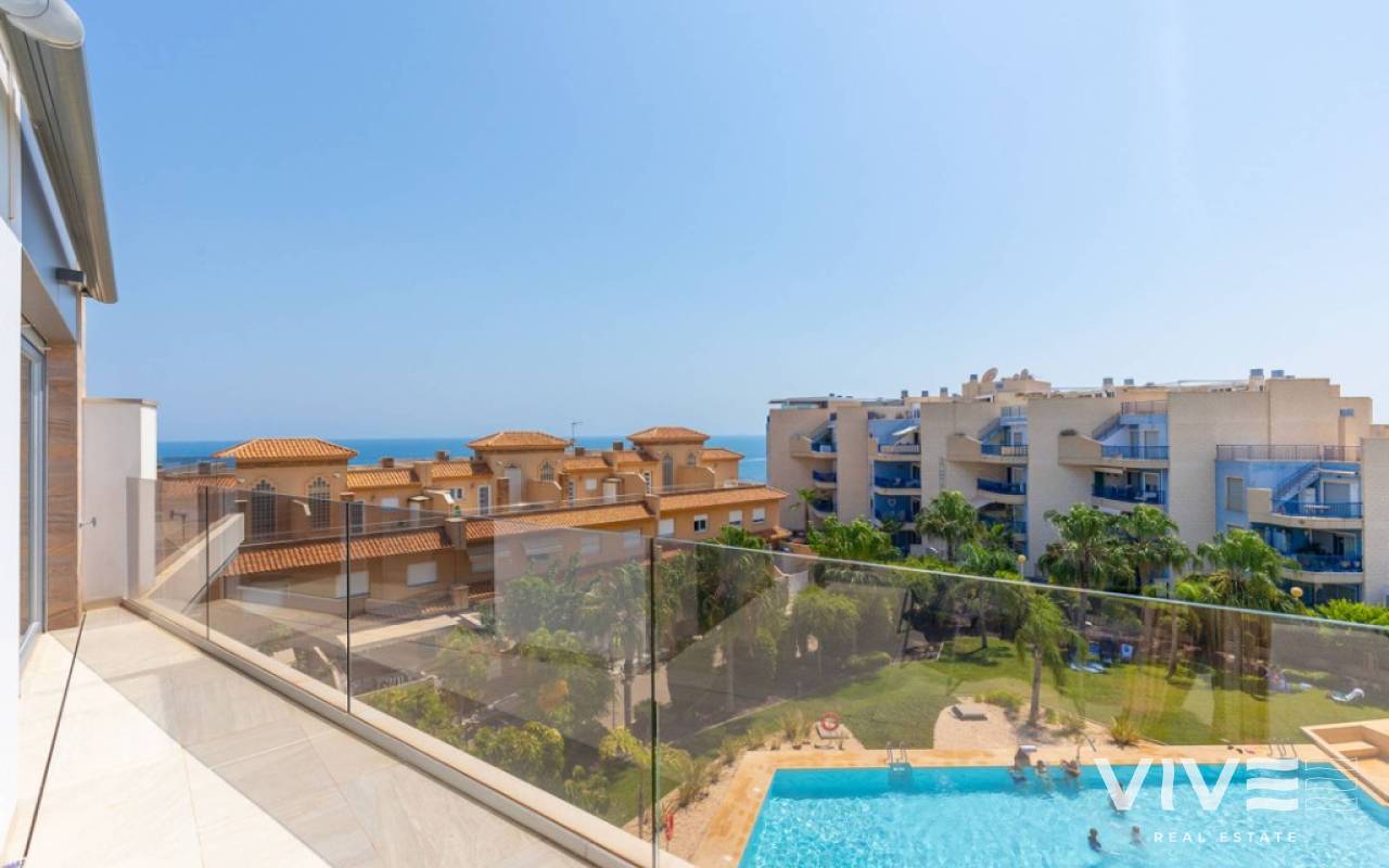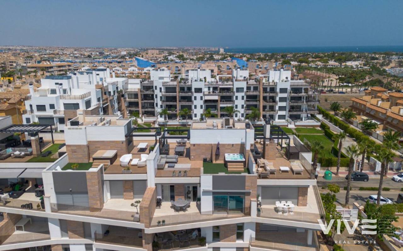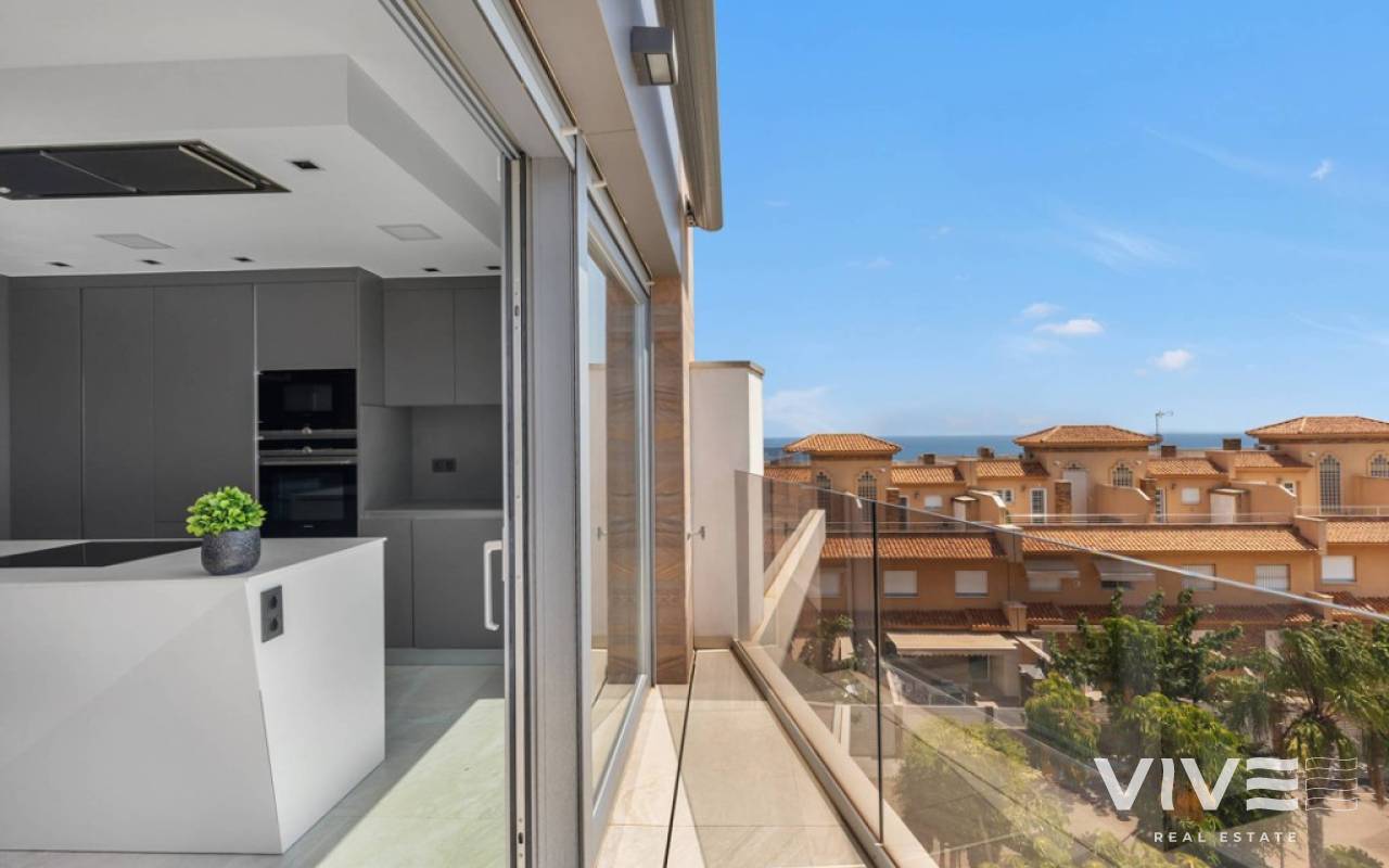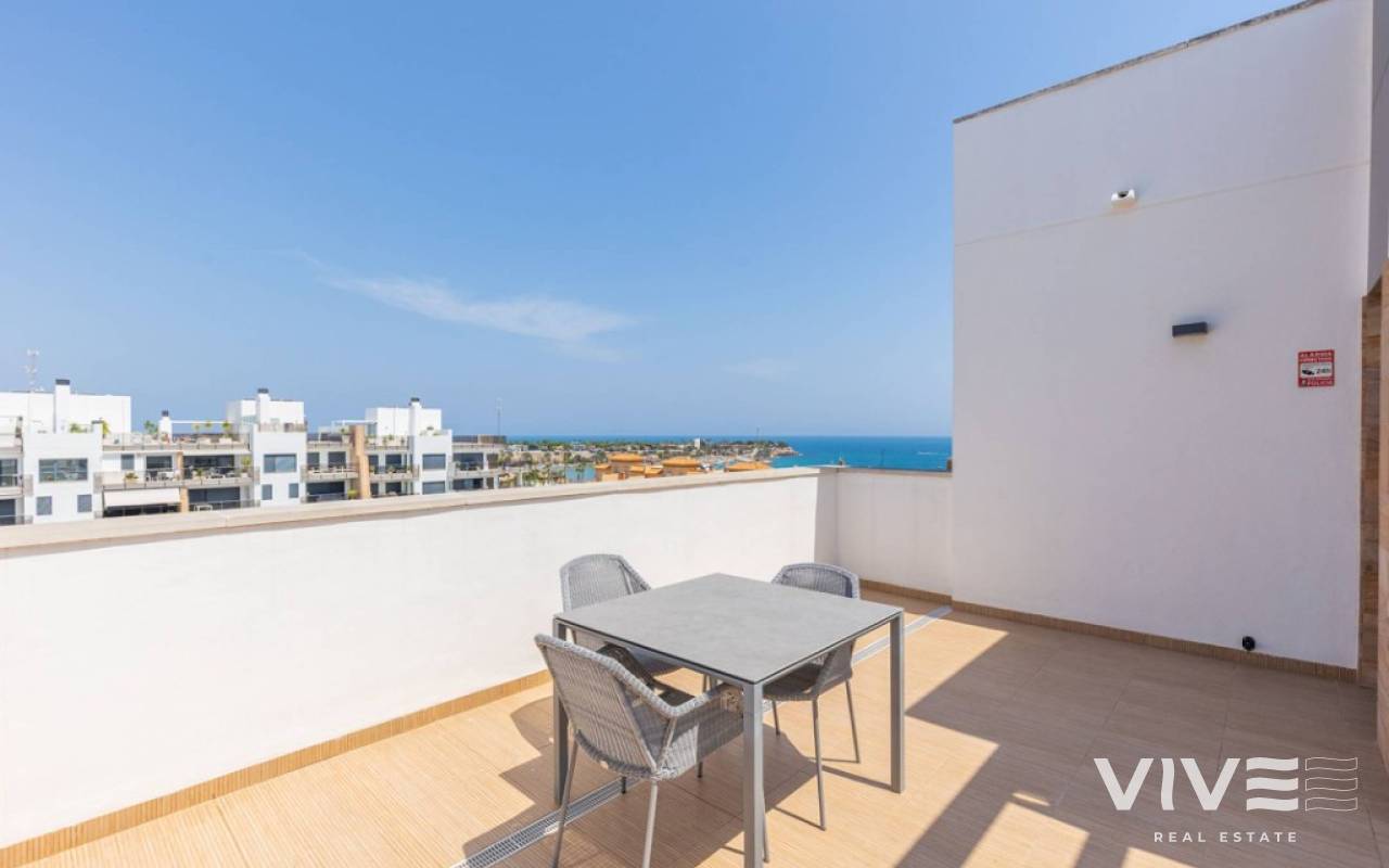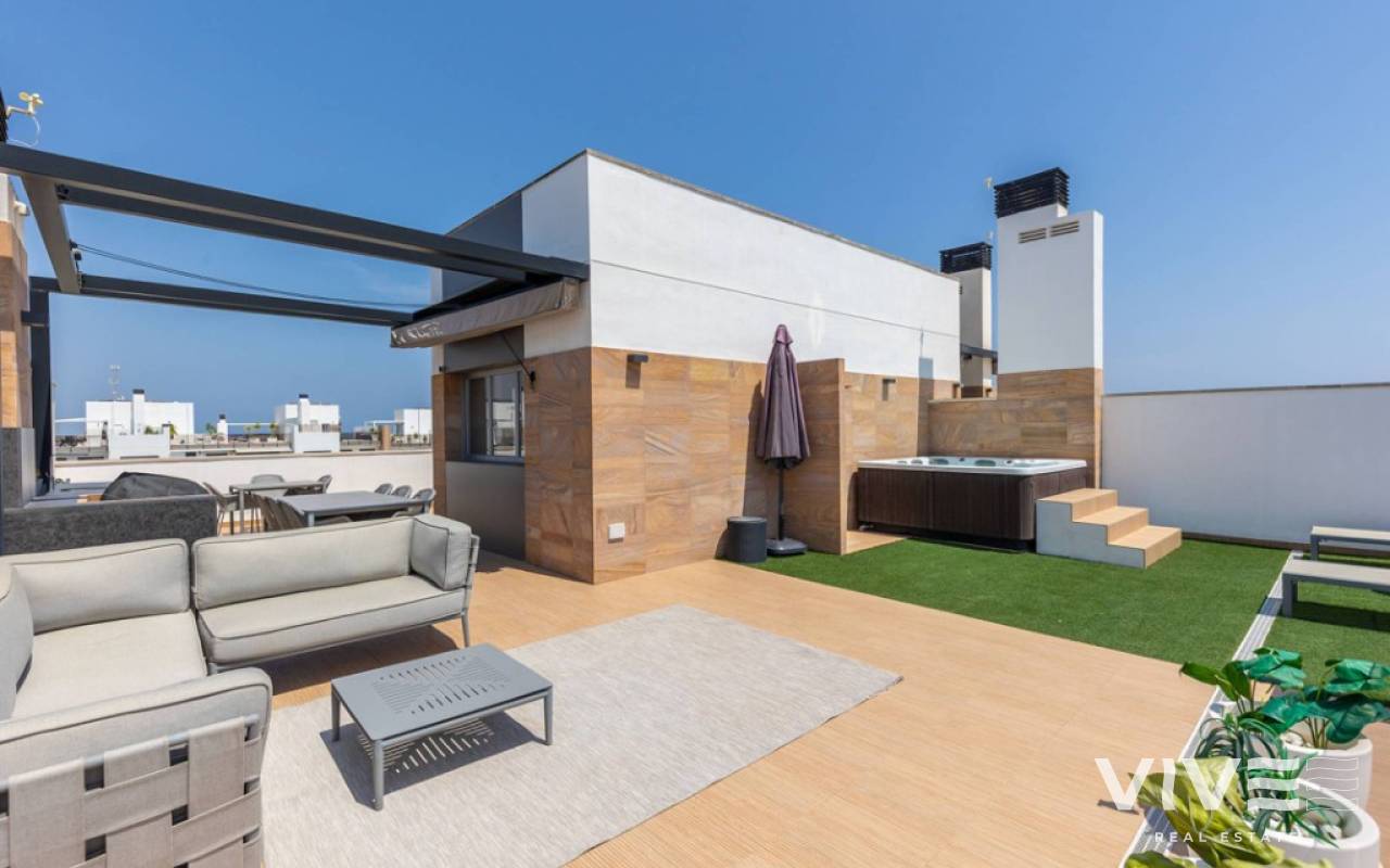 For sale luxury penthouse with panoramic views close to the beach in Bioko DeLUX, Cabo Roig, Orihuela Costa.Opportunities like this are rare — the Bioko Delux penthouses are among the most sought-after homes on the entire Costa Blanca South, and they hardly ever come onto the market. EStyle offers you for sale this spectacular three-bedroom, two-bathroom penthouse, this is the second-closest penthouse in the entire development and the complex itself being second line to the beach. Spacious private roof terrace complete with a jacuzzi, fully equipped outdoor kitchen and from here you have breathtaken panoramic sea views. It is a perfect place for entertaining, relaxing in the sun with family or friends. The Bioko Delux development offers first-class facilities, including:1) A large communal pool2) Indoor spa with heated pool, sauna, and changing rooms3) Gym4) Social areaA private garage space and storage room are also included in the price.