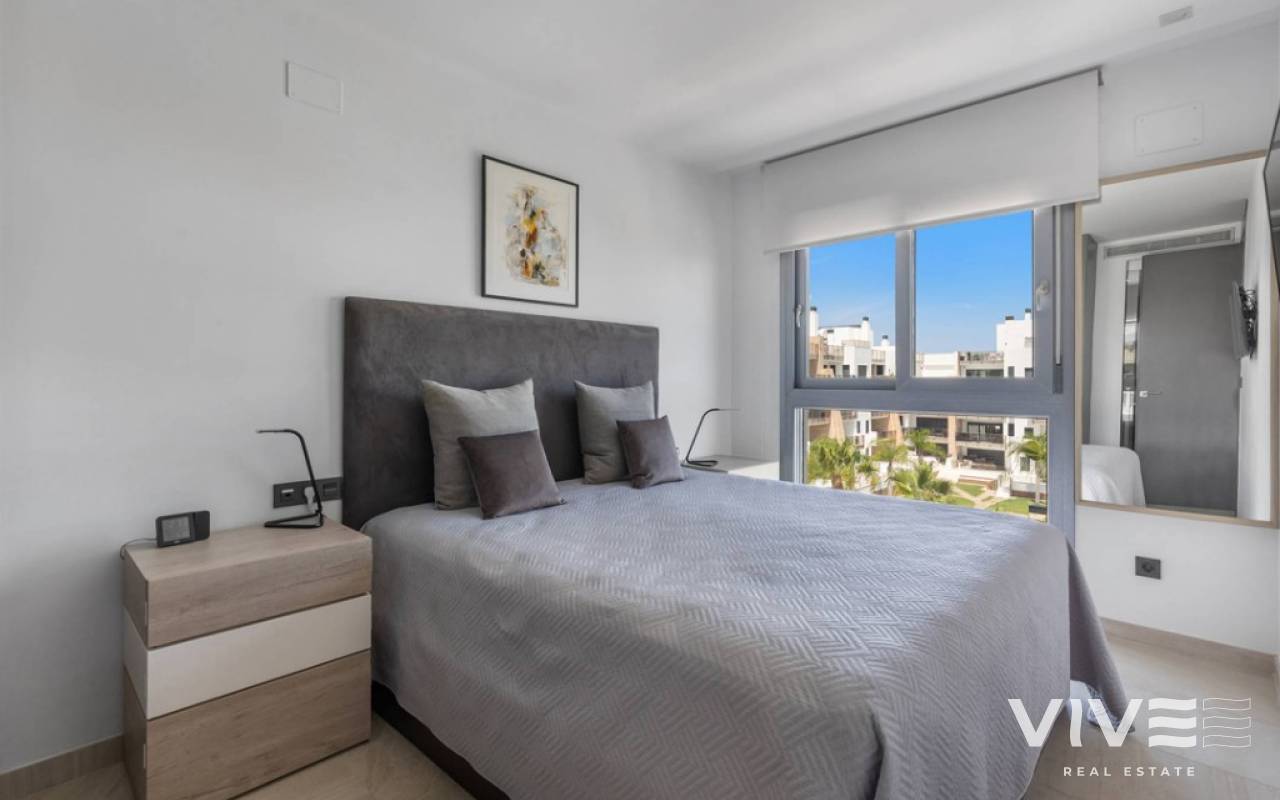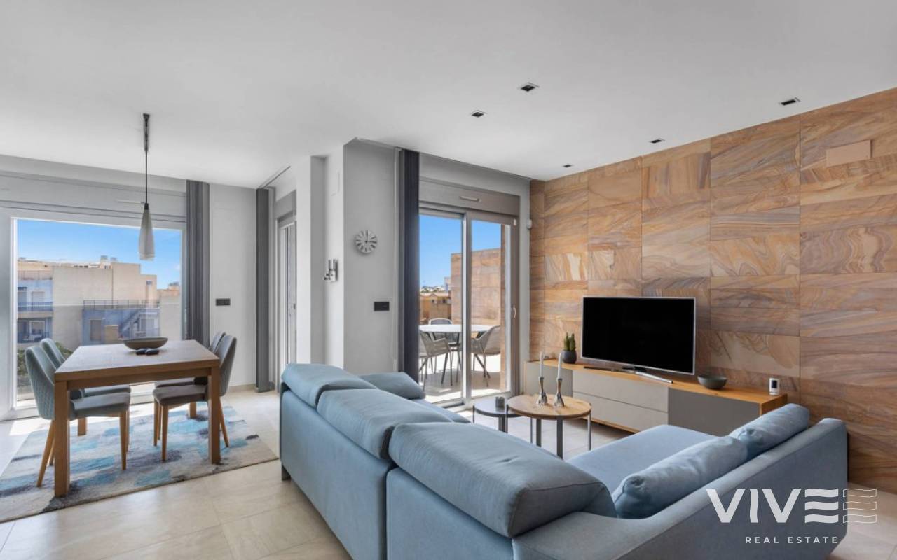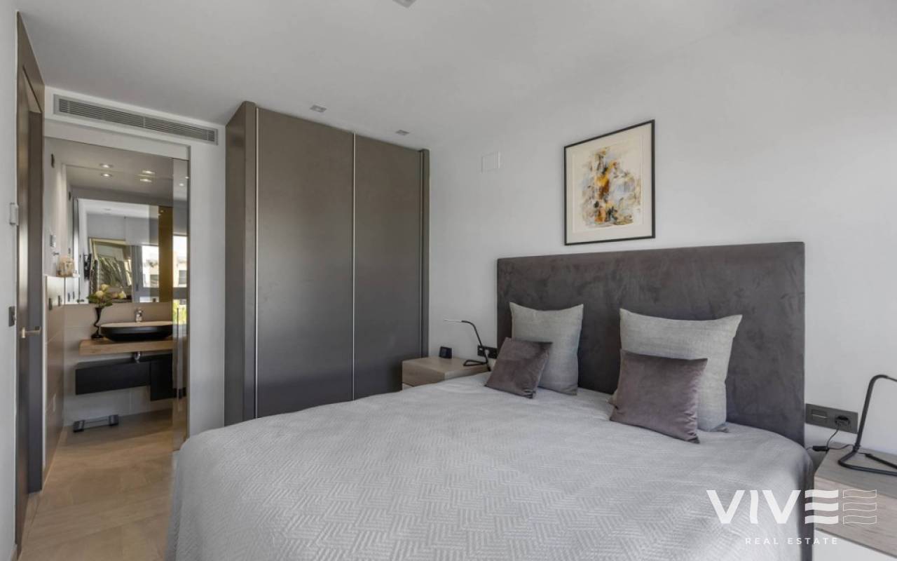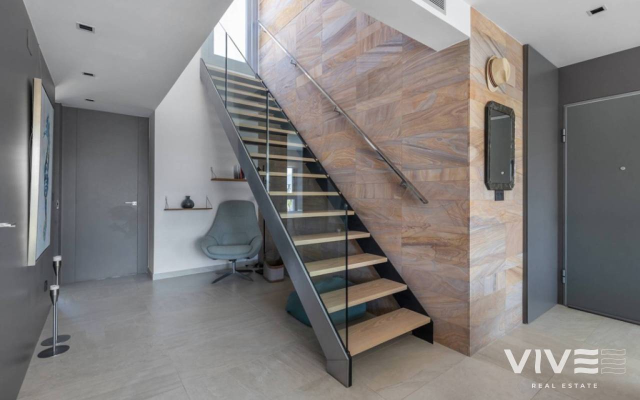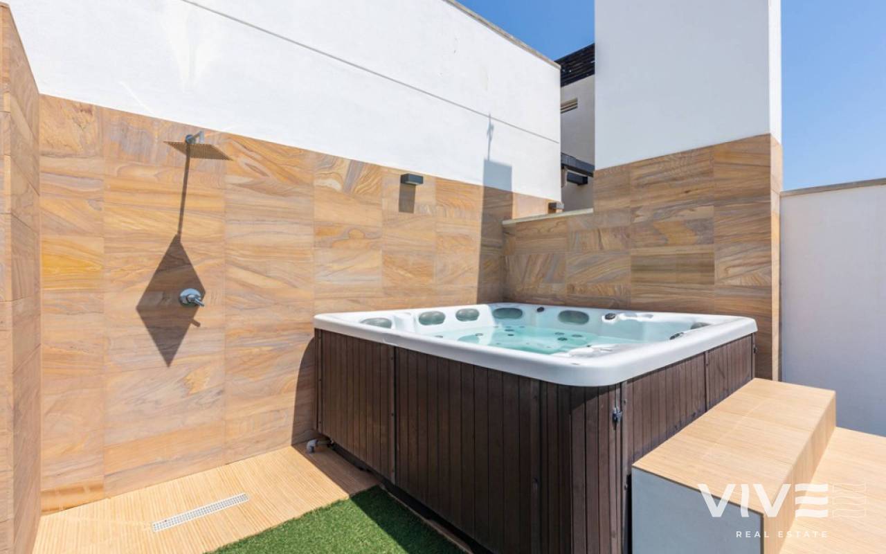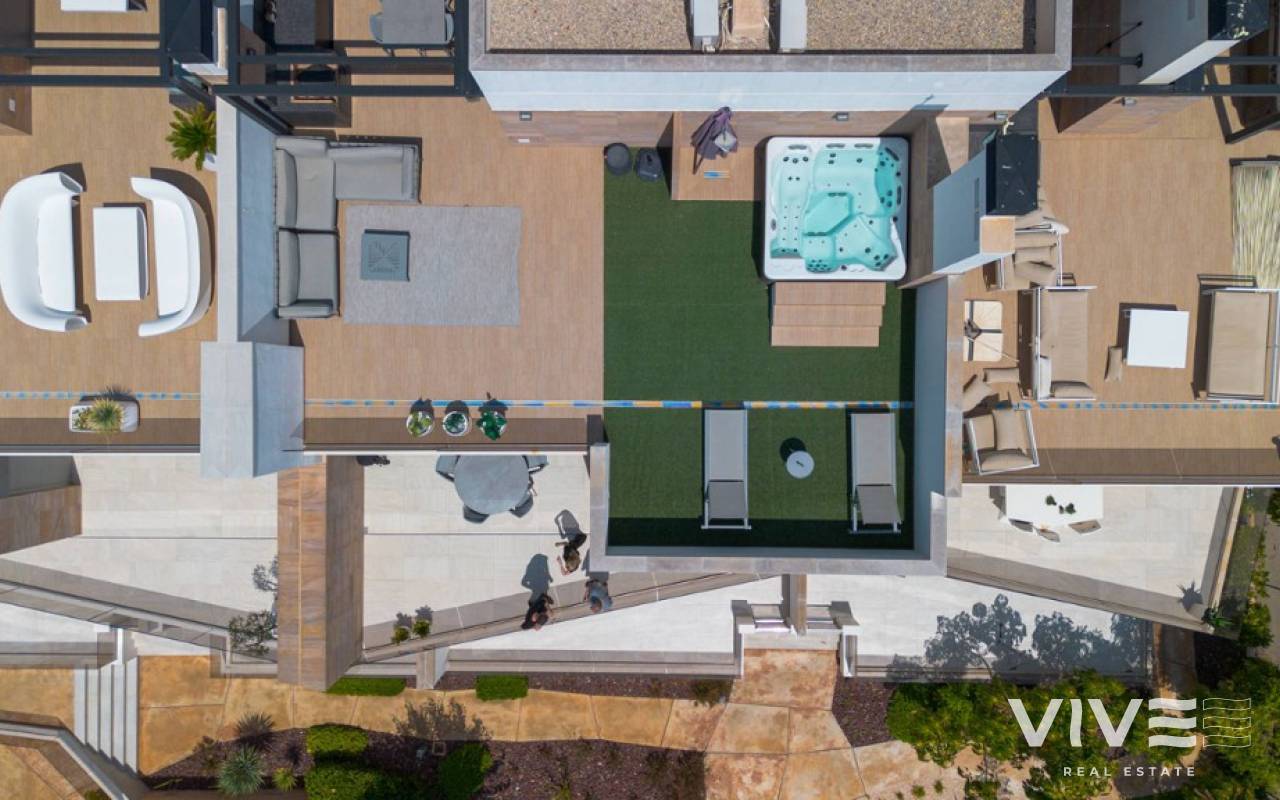 For sale luxury penthouse with panoramic views close to the beach in Bioko DeLUX, Cabo Roig, Orihuela Costa.Opportunities like this are rare — the Bioko Delux penthouses are among the most sought-after homes on the entire Costa Blanca South, and they hardly ever come onto the market. EStyle offers you for sale this spectacular three-bedroom, two-bathroom penthouse, this is the second-closest penthouse in the entire development and the complex itself being second line to the beach. Spacious private roof terrace complete with a jacuzzi, fully equipped outdoor kitchen and from here you have breathtaken panoramic sea views. It is a perfect place for entertaining, relaxing in the sun with family or friends. The Bioko Delux development offers first-class facilities, including:1) A large communal pool2) Indoor spa with heated pool, sauna, and changing rooms3) Gym4) Social areaA private garage space and storage room are also included in the price.