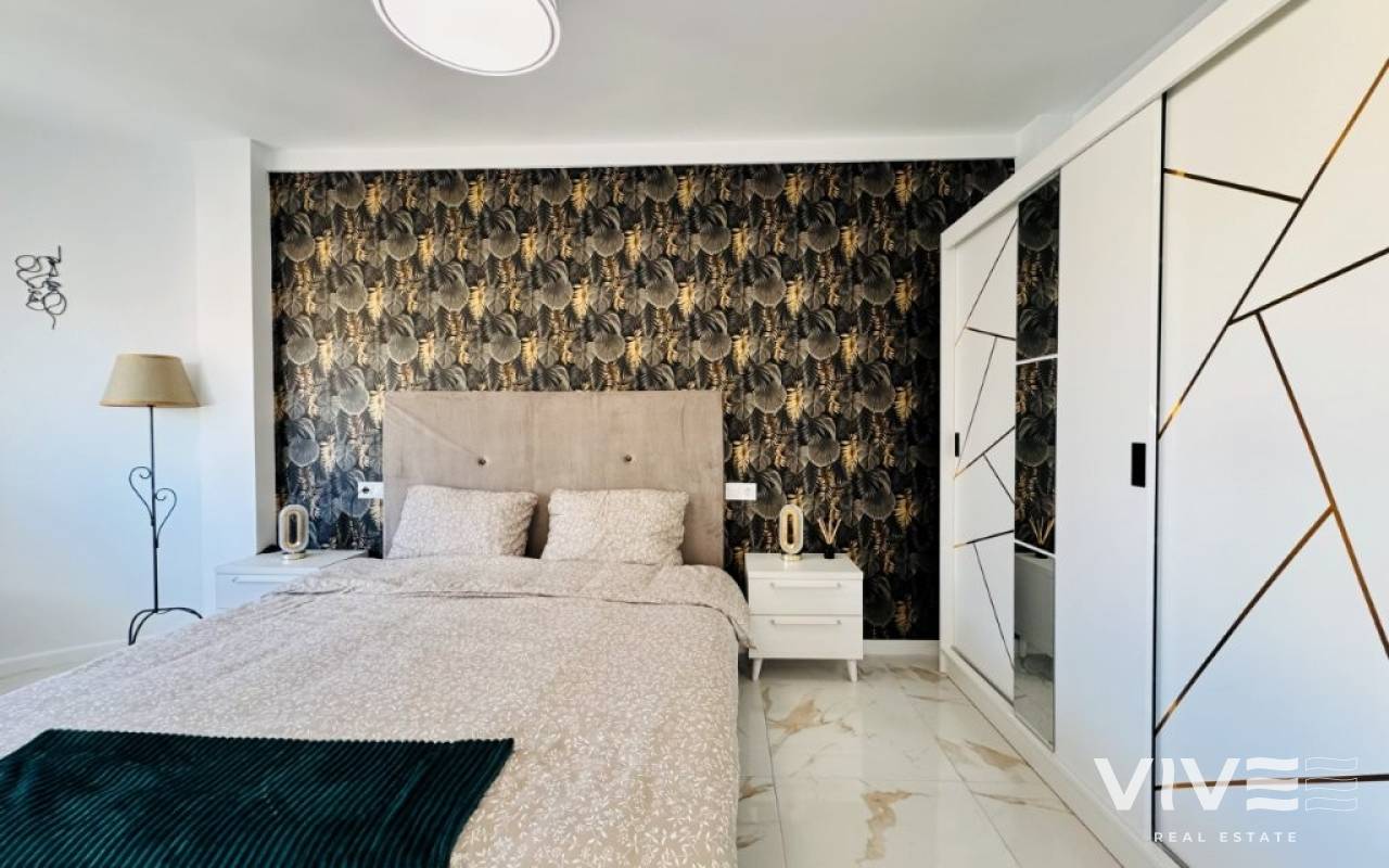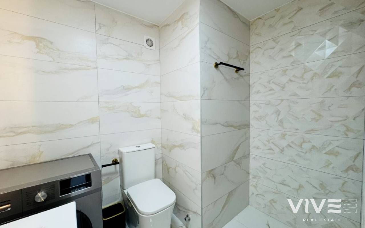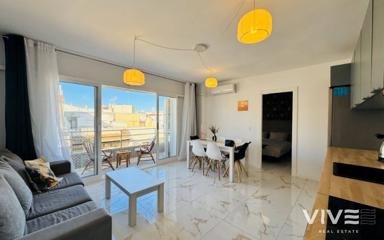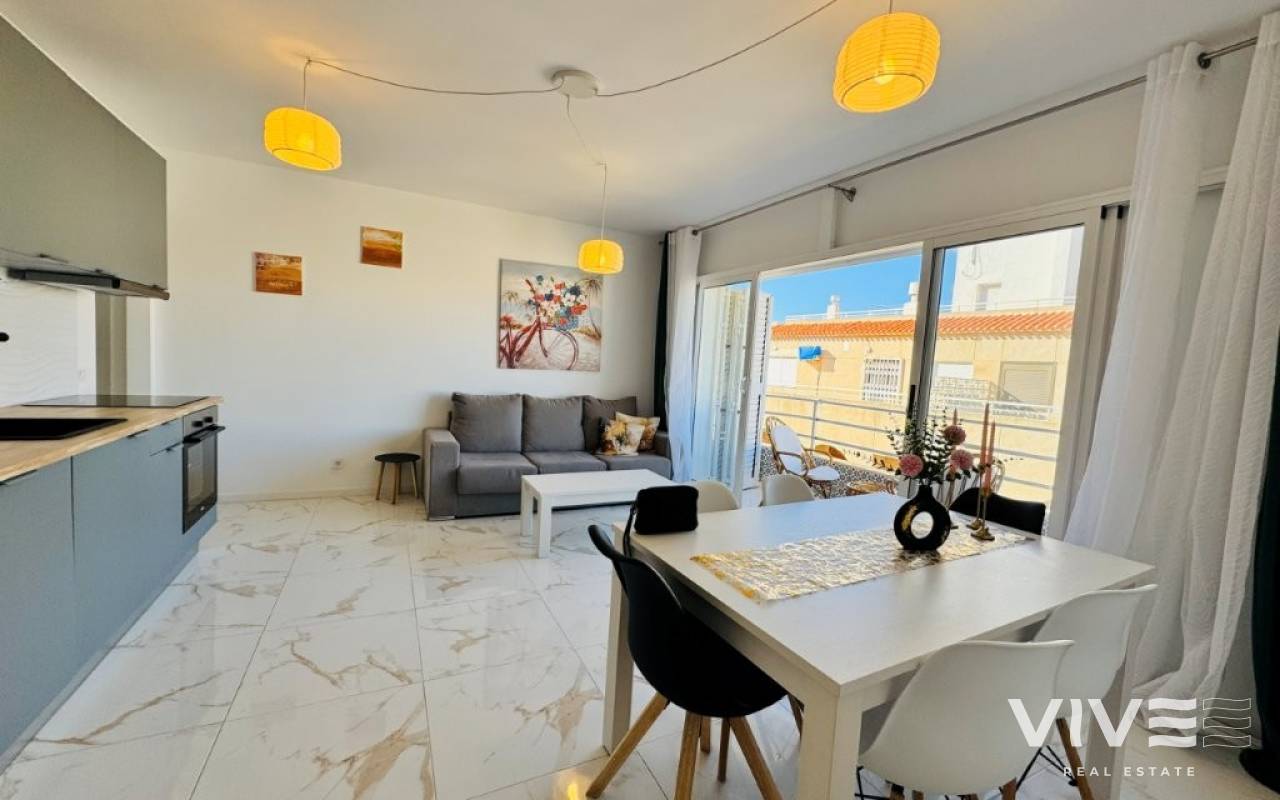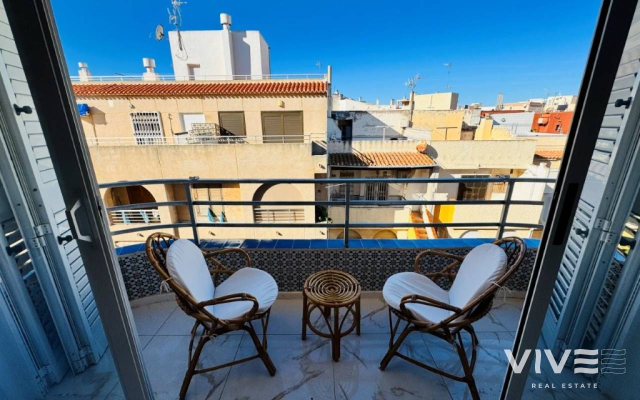 This apartment is located in the heart of La Mata, just 10 meters from the beach, in a beachfront building. The apartment is on the 4th and top floor of the building, which has two elevators. It has 76 square meters of living space, distributed into an open-plan living room, dining room, and kitchen, three bedrooms, and two bathrooms. It features a west-facing terrace (afternoon sun). The apartment has been completely renovated and is being sold furnished and equipped. It has air conditioning and is ready to move into. Community fees: €530 per year Property tax (IBI): €228
