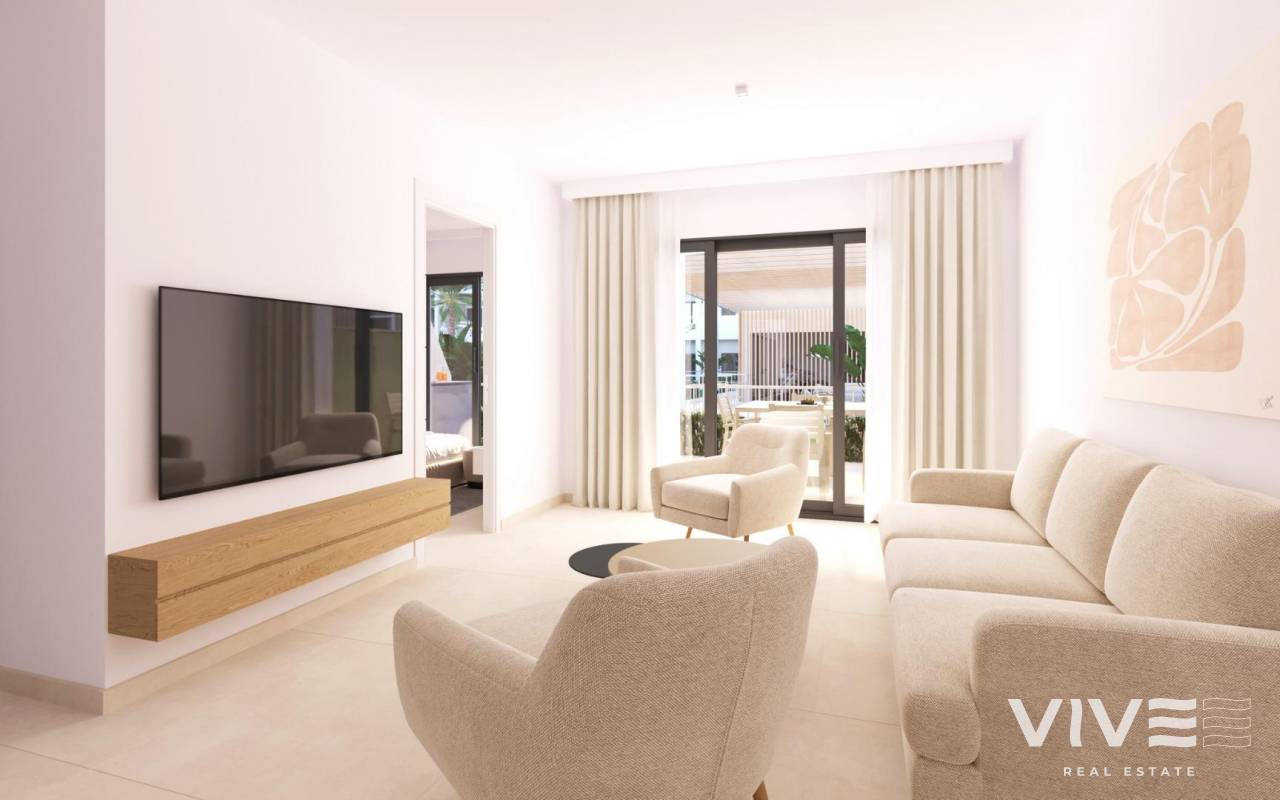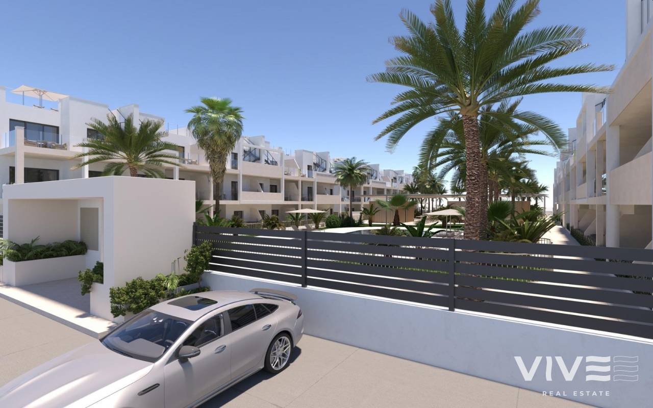 Modern New Build Apartments in San Cayetano, Torrepacheco, Murcia Contemporary Living in a Peaceful Mediterranean Setting This exclusive new residential complex is located in San Cayetano, Murcia, part of the municipality of Torre Pacheco, just 9 km from the sea and surrounded by several renowned golf courses. The project combines tranquility, comfort and contemporary design, offering an ideal environment for permanent living, holiday use or investment on the Costa Calida. The development consists of 72 apartments with 2 and 3 bedrooms and 2 bathrooms, one of them ensuite, distributed across four modern buildings. A second phase with bungalows and villas is also planned, adding further value and appeal to the area. Designed Communal Areas for Relaxation and Wellbeing Residents will enjoy carefully landscaped communal spaces that include two swimming pools, beautiful gardens and a fully equipped gym. These areas create a pleasant and social environment where neighbors can relax, exercise and enjoy the Mediterranean lifestyle. The residential complex also features 40 kW of photovoltaic solar panels that help support the community electricity costs, contributing to a more sustainable and energy efficient living environment. Apartments with Private Outdoor Spaces and Solarium Each apartment is designed to make the most of outdoor living. Ground floor properties include private gardens, first floor apartments offer spacious terraces, and top floor homes benefit from both a terrace and a private rooftop solarium. All properties include a summer kitchen on the terrace or solarium, perfect for enjoying the sun all year round. All homes come with an outdoor parking space and a private storage room in the basement, adding extra convenience and practicality. Quality Features and Energy Efficient Installations These new build apartments are delivered with quality finishes and modern installations to ensure comfort and functionality, including: Fully fitted kitchen with appliances Fully equipped bathrooms with furniture, mirror, lighting and shower screens Preinstallation for ducted air conditioning Aerothermal system for hot water The combination of modern materials and energy efficient systems makes these homes ideal for year round use. Excellent Location Close to Golf, Beaches and Services San Cayetano is a quiet and well connected village with local amenities, shops and services. Its strategic location allows easy access to beaches, golf courses and major transport links. Key distances to points of interest include: Mar Menor beaches 9 km Roda Golf 6 km La Serena Golf 14 km Los Alcazares 10 km Cartagena 30 km Murcia Corvera Airport 25 km Alicante Airport 90 km Secure Your Property in San Cayetano Today This modern residential complex offers an excellent opportunity to enjoy Mediterranean living in a peaceful yet well connected area. Contact us today for more information and reserve your new build apartment in San Cayetano.