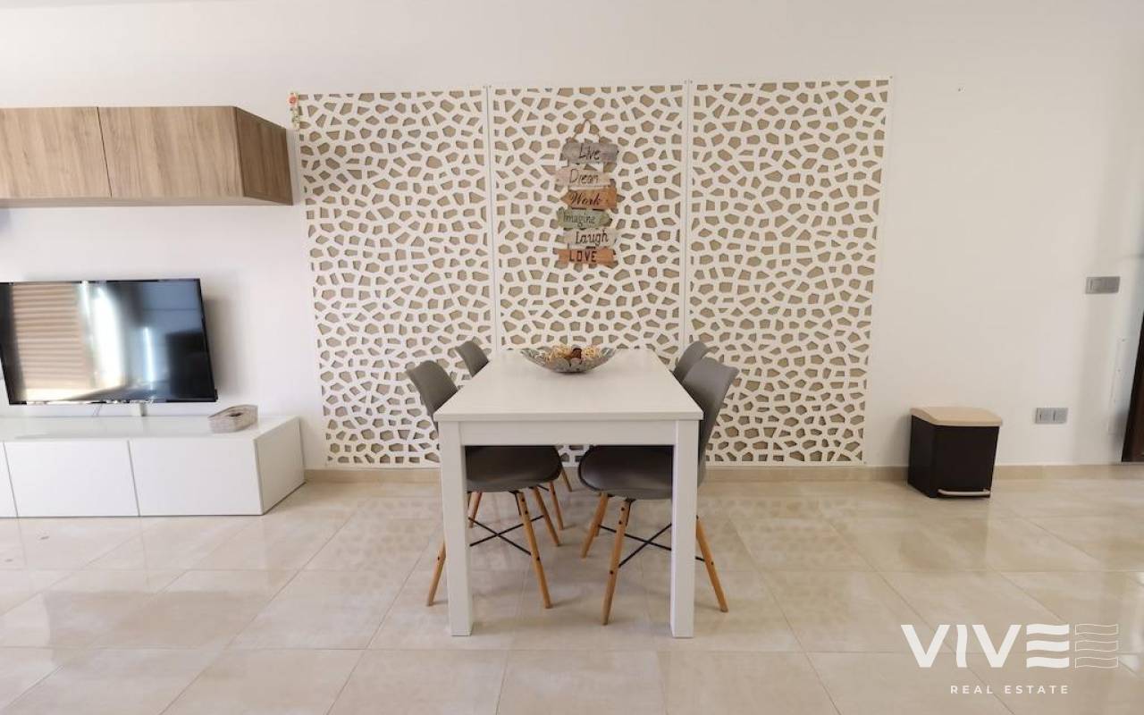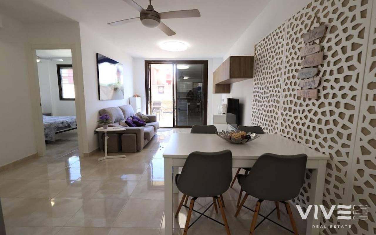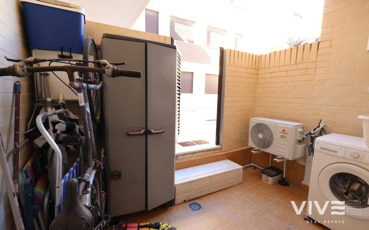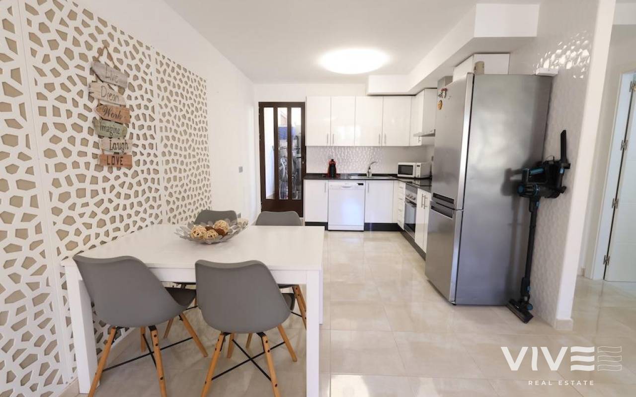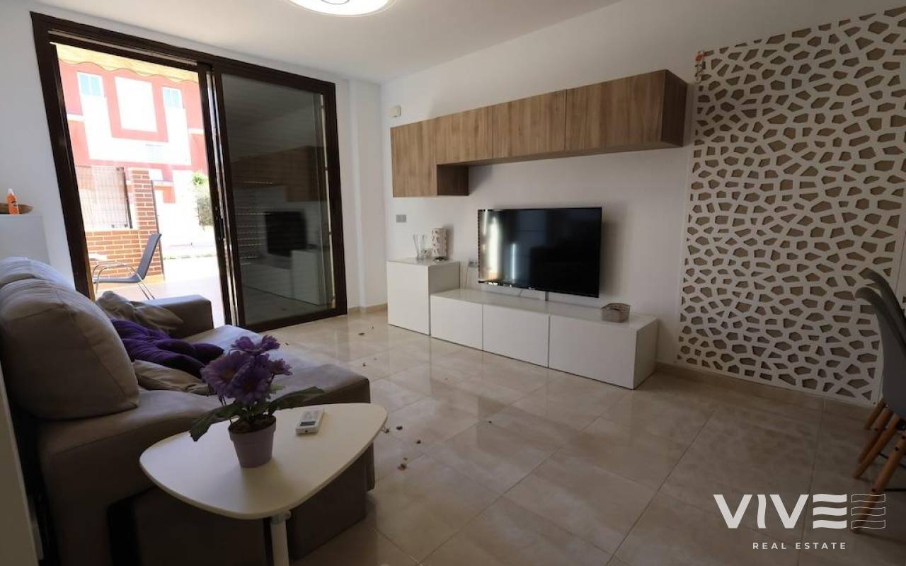 Lomas de Cabo Roig, Ground floor bungalow with a large tiled garden of about 30 m2, 64 m2 house with 2 bedrooms, 2 bathrooms, open kitchen to living room, back patio from which you can access the communal pool, the house is sold furnished and with air conditioning.