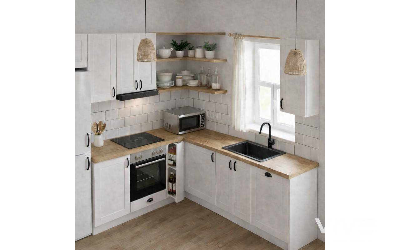 The independent kitchen ensures practicality for daily use, while two balconies — located on the living room level and upper bedroom level — provide outdoor spaces at different heights and moments of the day.