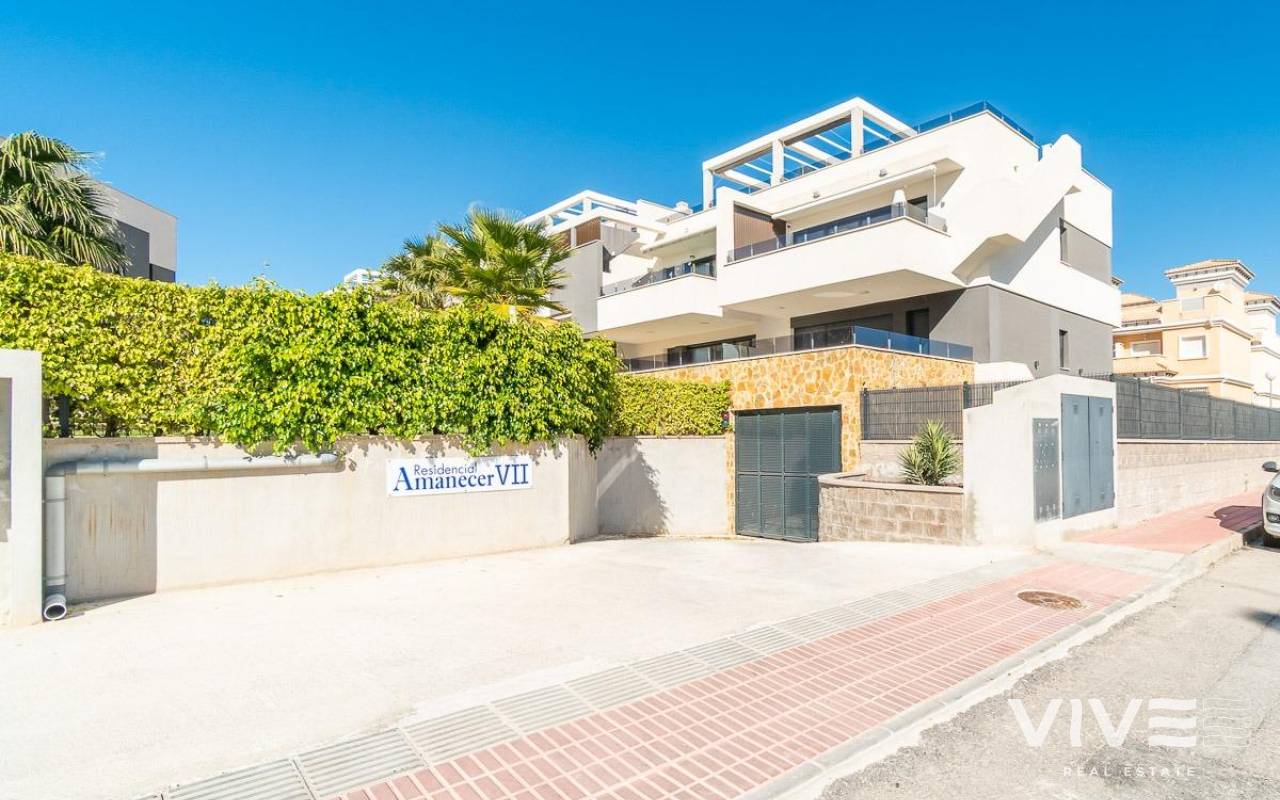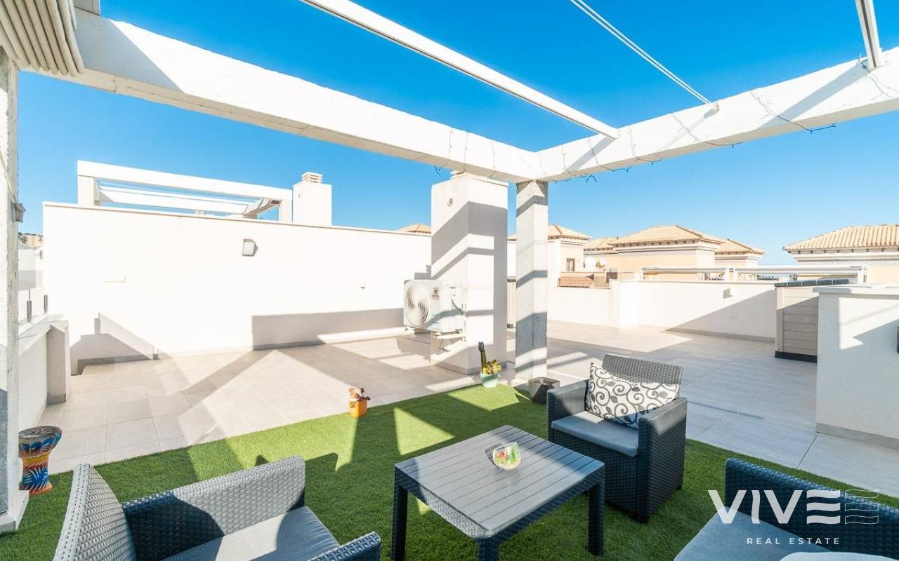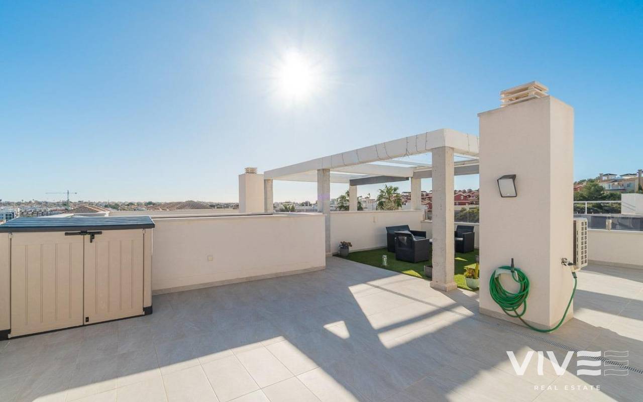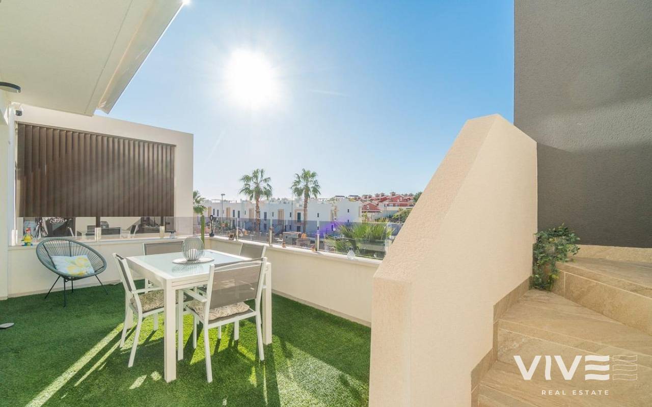 Discover this spectacular top-floor bungalow located in the prestigious PAU 26 area of Orihuela Costa, a privileged enclave where modern design, comfort, and quality of life come together.. . This nearly new property, built in 2022, offers 76 m2 of constructed area, a functional layout, and an excellent south-facing orientation, ensuring natural light throughout the day.. . From the street, you enter a private and exclusive residential complex with only 24 neighbors, guaranteeing peace, privacy, and a select atmosphere. Upon entering the home, you are welcomed by a bright and spacious living-dining area with a modern open-plan kitchen. From the living room, there is access to a 12 m2 balcony, equipped with an electric awning and artificial grass, perfect for enjoying outdoor living all year round thanks to its sunny orientation.. The property also features a laundry area, two spacious double bedrooms, and two full bathrooms, both with underfloor heating, offering exceptional comfort.. . From the balcony, a private staircase leads to the highlight of the property: an impressive private solarium of approximately 71 m2, finished with artificial grass and awnings, creating the perfect space for a private chill-out area, entertaining guests, or relaxing under the Mediterranean sun.. . Additional features include porcelain flooring, mosquito screens on all windows, security entrance door, electric awning on the balcony, and a manual awning on the solarium pergola, all designed to maximize comfort and functionality.. . The property is sold with a private parking space and a closed storage room, providing extra convenience and storage.. . The residential complex offers a beautiful communal swimming pool, immaculately maintained green areas, and high-quality communal spaces, making it a true luxury environment.. . Located just 3.5 km from the sea, the property is close to some of the most renowned beaches in Orihuela Costa, such as La Zenia and Playa Flamenca, famous for their crystal-clear waters and excellent services.. . Its proximity to prestigious golf courses makes this home a highly sought-after holiday rental investment with excellent rental potential.. . A property designed to offer exclusivity, comfort, and an exceptional Mediterranean lifestyle.. A unique opportunity not to be missed. Contact us today.. Price: €349,000. Taxes and purchase costs not included (according to applicable regulations). A breakdown of additional costs will be provided prior to reservation.