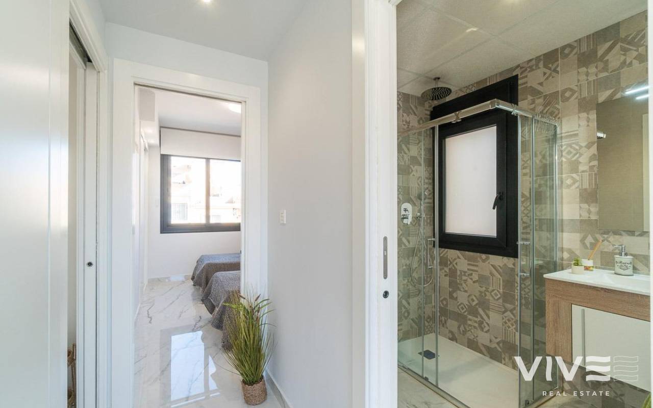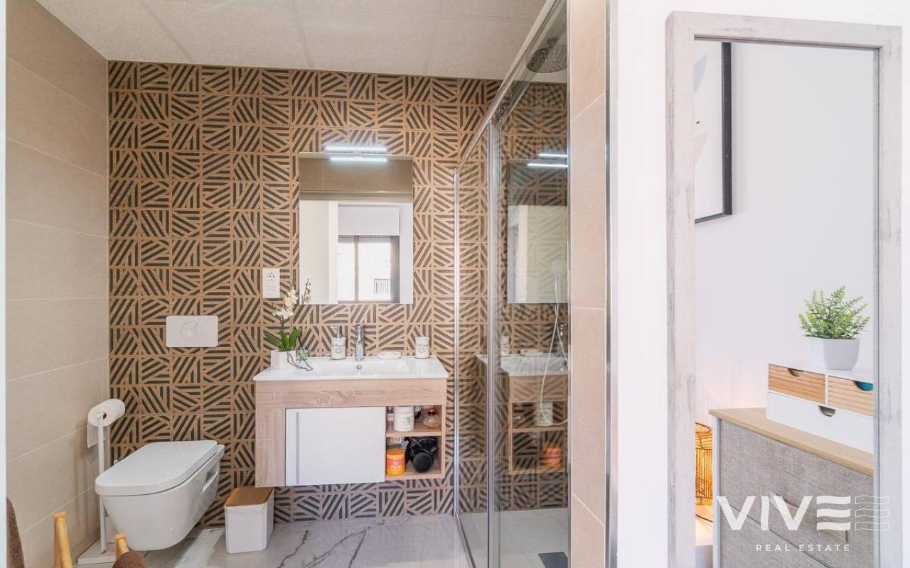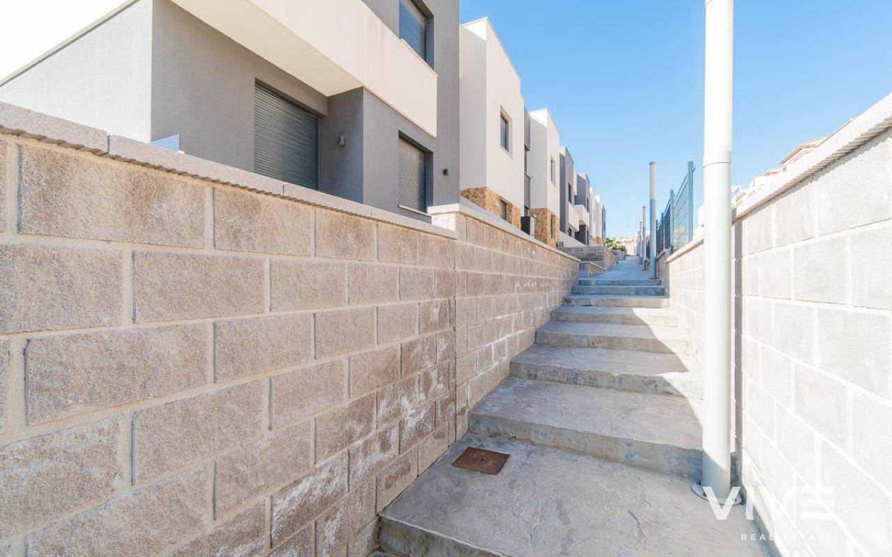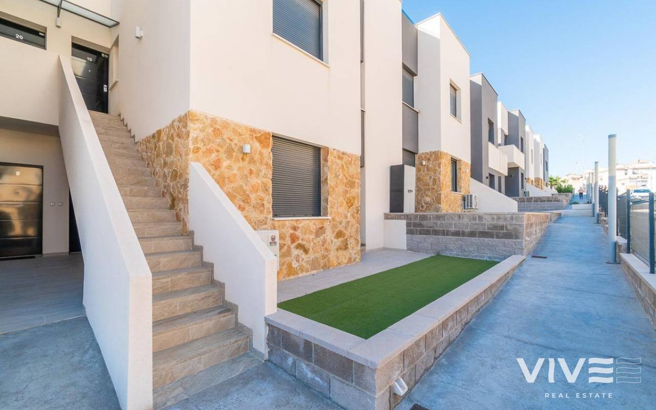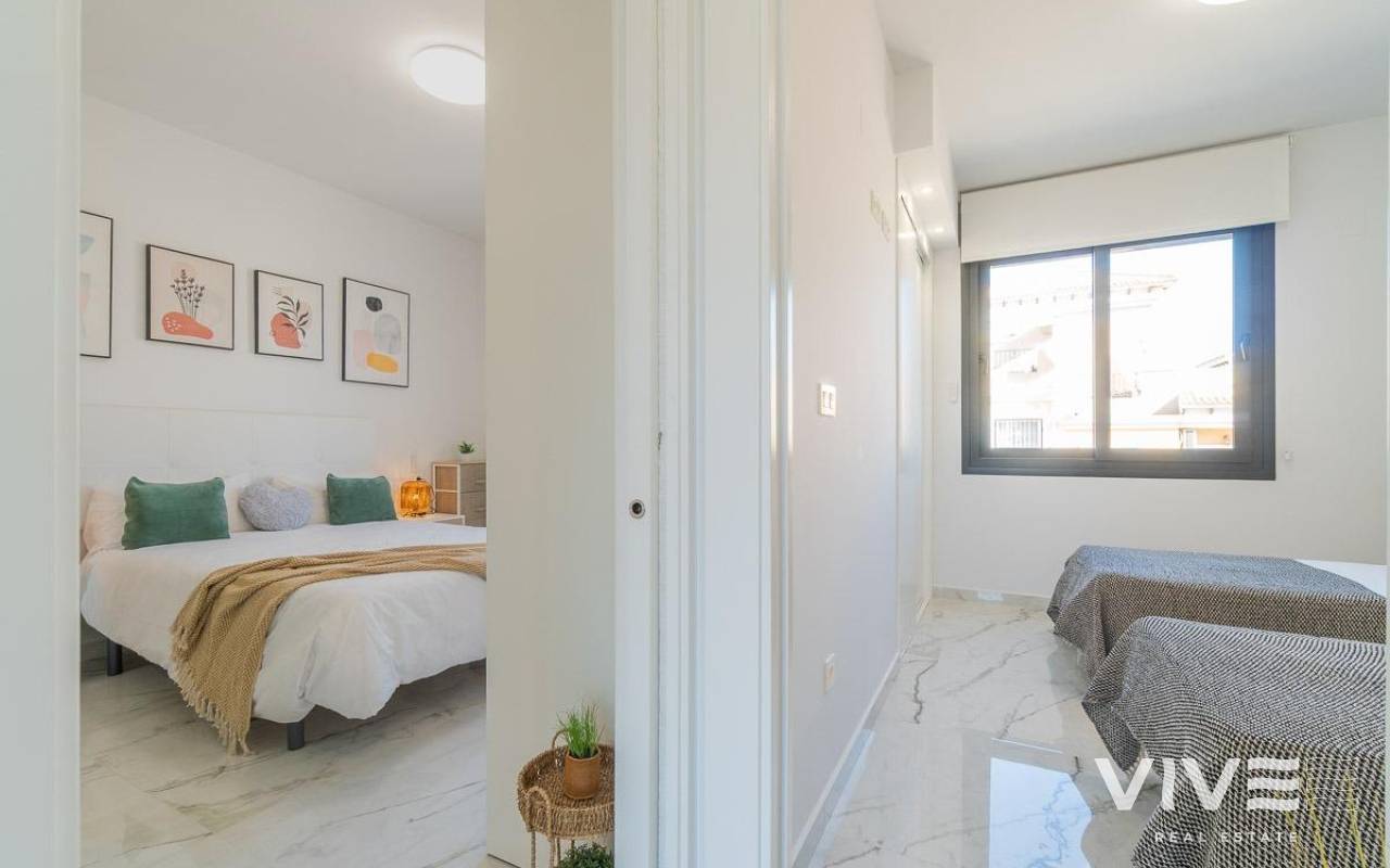 Discover this spectacular top-floor bungalow located in the prestigious PAU 26 area of Orihuela Costa, a privileged enclave where modern design, comfort, and quality of life come together.. . This nearly new property, built in 2022, offers 76 m2 of constructed area, a functional layout, and an excellent south-facing orientation, ensuring natural light throughout the day.. . From the street, you enter a private and exclusive residential complex with only 24 neighbors, guaranteeing peace, privacy, and a select atmosphere. Upon entering the home, you are welcomed by a bright and spacious living-dining area with a modern open-plan kitchen. From the living room, there is access to a 12 m2 balcony, equipped with an electric awning and artificial grass, perfect for enjoying outdoor living all year round thanks to its sunny orientation.. The property also features a laundry area, two spacious double bedrooms, and two full bathrooms, both with underfloor heating, offering exceptional comfort.. . From the balcony, a private staircase leads to the highlight of the property: an impressive private solarium of approximately 71 m2, finished with artificial grass and awnings, creating the perfect space for a private chill-out area, entertaining guests, or relaxing under the Mediterranean sun.. . Additional features include porcelain flooring, mosquito screens on all windows, security entrance door, electric awning on the balcony, and a manual awning on the solarium pergola, all designed to maximize comfort and functionality.. . The property is sold with a private parking space and a closed storage room, providing extra convenience and storage.. . The residential complex offers a beautiful communal swimming pool, immaculately maintained green areas, and high-quality communal spaces, making it a true luxury environment.. . Located just 3.5 km from the sea, the property is close to some of the most renowned beaches in Orihuela Costa, such as La Zenia and Playa Flamenca, famous for their crystal-clear waters and excellent services.. . Its proximity to prestigious golf courses makes this home a highly sought-after holiday rental investment with excellent rental potential.. . A property designed to offer exclusivity, comfort, and an exceptional Mediterranean lifestyle.. A unique opportunity not to be missed. Contact us today.. Price: €349,000. Taxes and purchase costs not included (according to applicable regulations). A breakdown of additional costs will be provided prior to reservation.