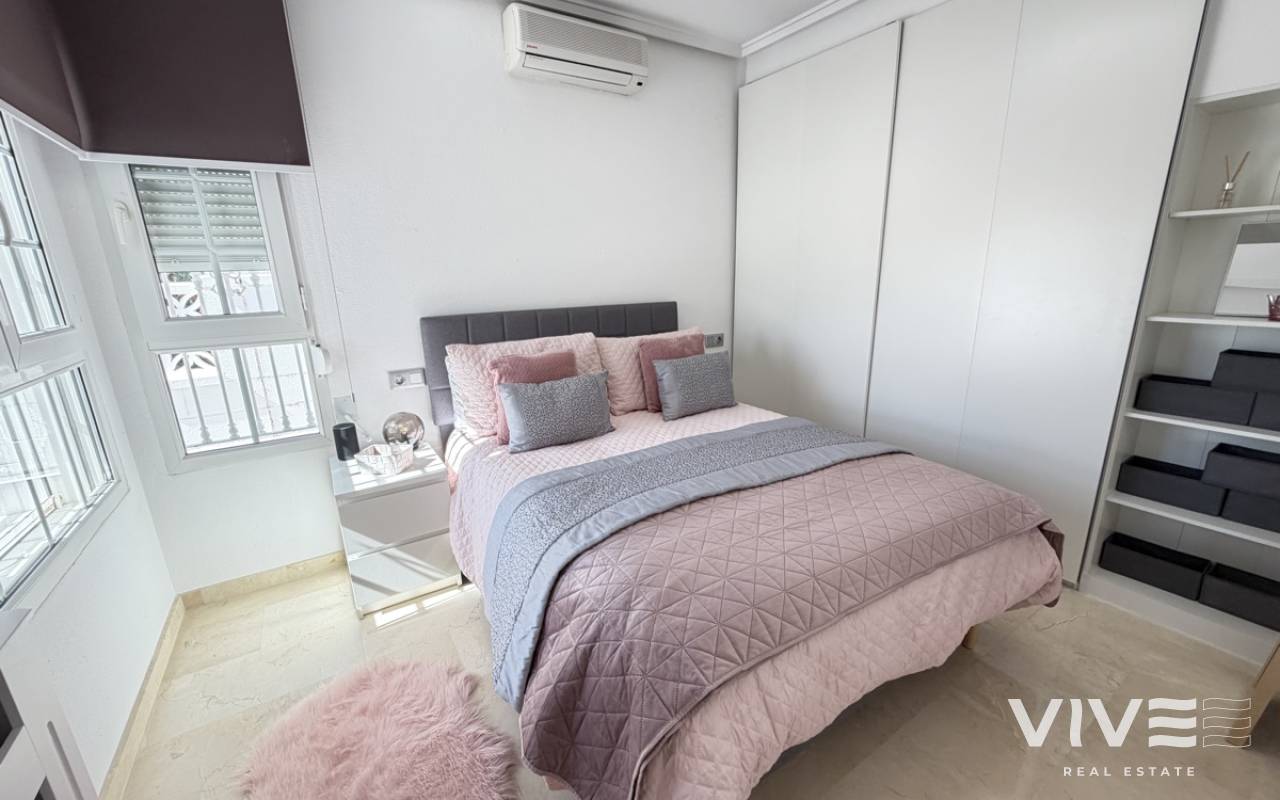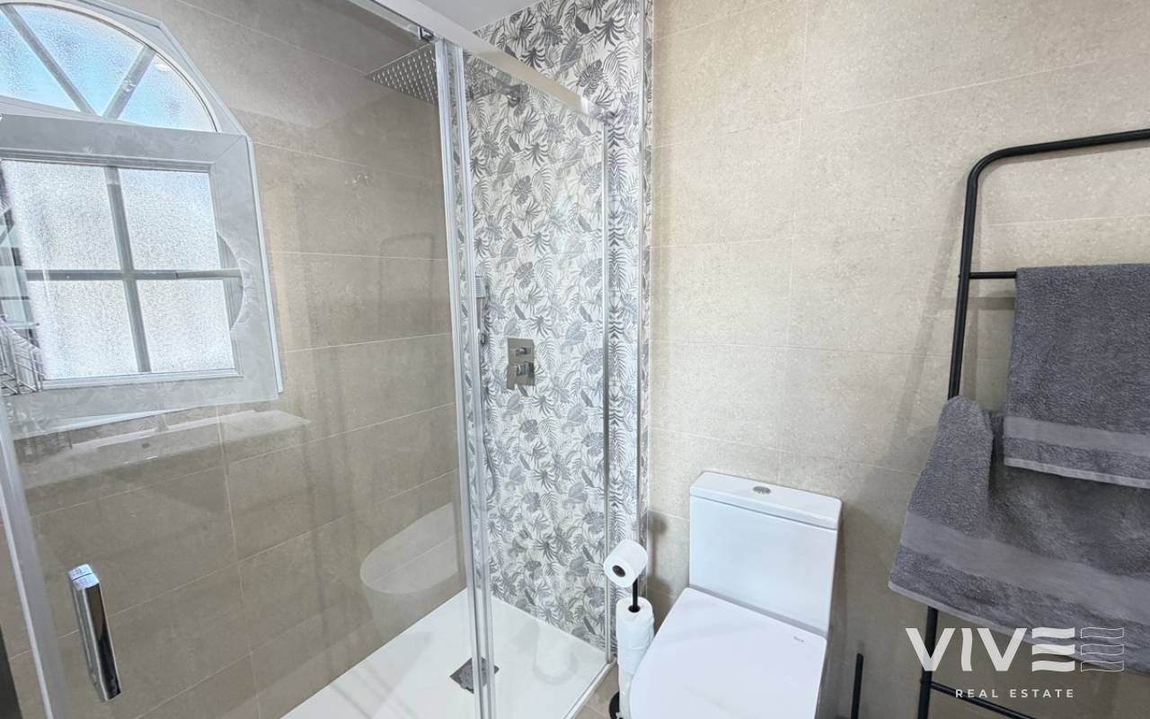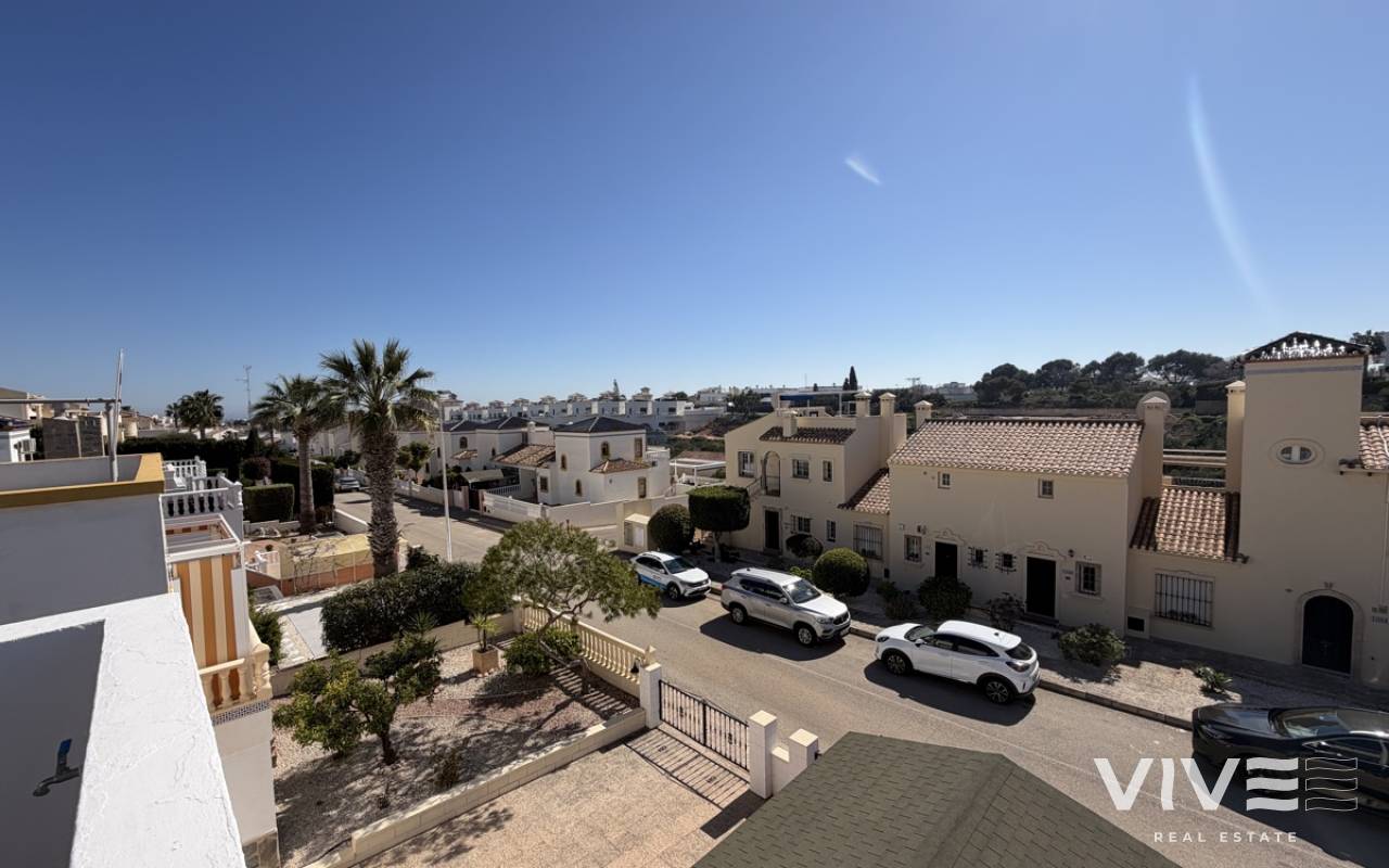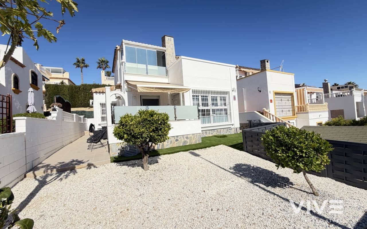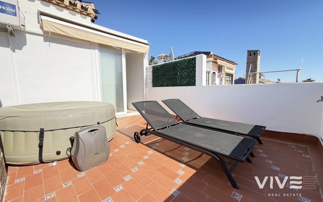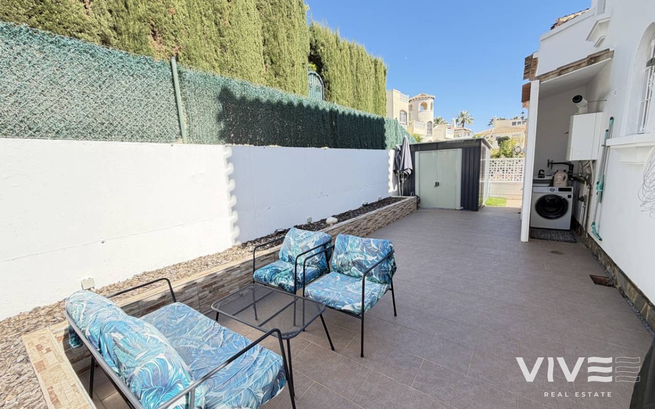 Beautifully presented three-bedroom, two-bathroom detached villa located in the highly sought-after area of Los Dolses on the stunning Orihuela Costa. Finished to an exceptional show home standard, this impressive villa offers bright, spacious, and versatile living throughout. The welcoming lounge area seamlessly connects to the third bedroom, currently utilised as an elegant dining space, providing flexibility to suit your lifestyle. The separate modern kitchen is both stylish and practical, fully equipped with a double oven, integrated microwave, and a built-in coffee machine station — perfect for contemporary living and entertaining. The ground floor also features a generously sized guest bedroom with fitted wardrobes and a beautifully presented modern family bathroom finished to a high specification. Upstairs, the impressive master suite offers a sleek en-suite bathroom, sun room with folding glass curtains, and walk-in wardrobe. From here, you step out onto a large south-facing sun terrace complete with dedicated sun lounging space and a private Jacuzzi area — an ideal setting for relaxing or entertaining while enjoying the Mediterranean climate. Set on an elevated plot, the property benefits from covered off-road parking with a carport (with electric gates) and offers the option to install a private swimming pool, if desired. The spacious rear garden provides additional outdoor enjoyment, including a storage shed and a shaded seating area. This superb villa is offered part furnished to an excellent standard and further benefits from mains gas central heating, full air conditioning throughout, electric shutters on the upper level, and electric toldos for additional comfort and convenience. An idyllic small community of 22 villas which share a lovely quiet communal pool area. An exceptional opportunity to acquire a stylish, move-in-ready home in a prime coastal location.
