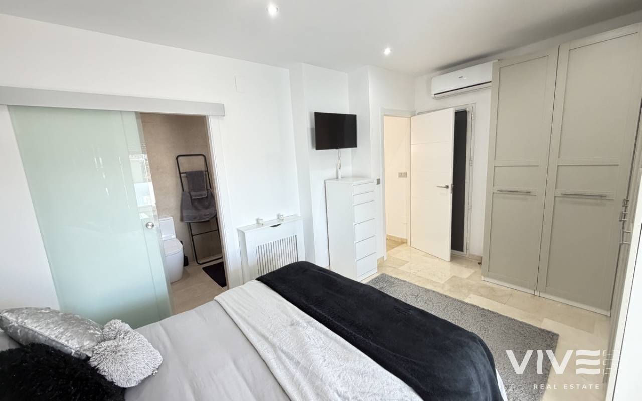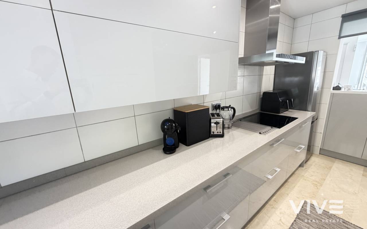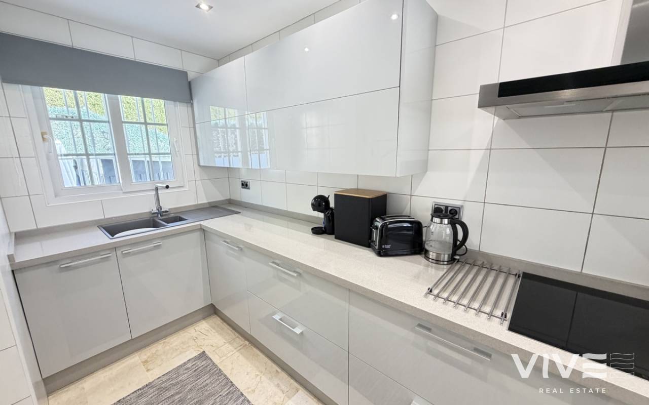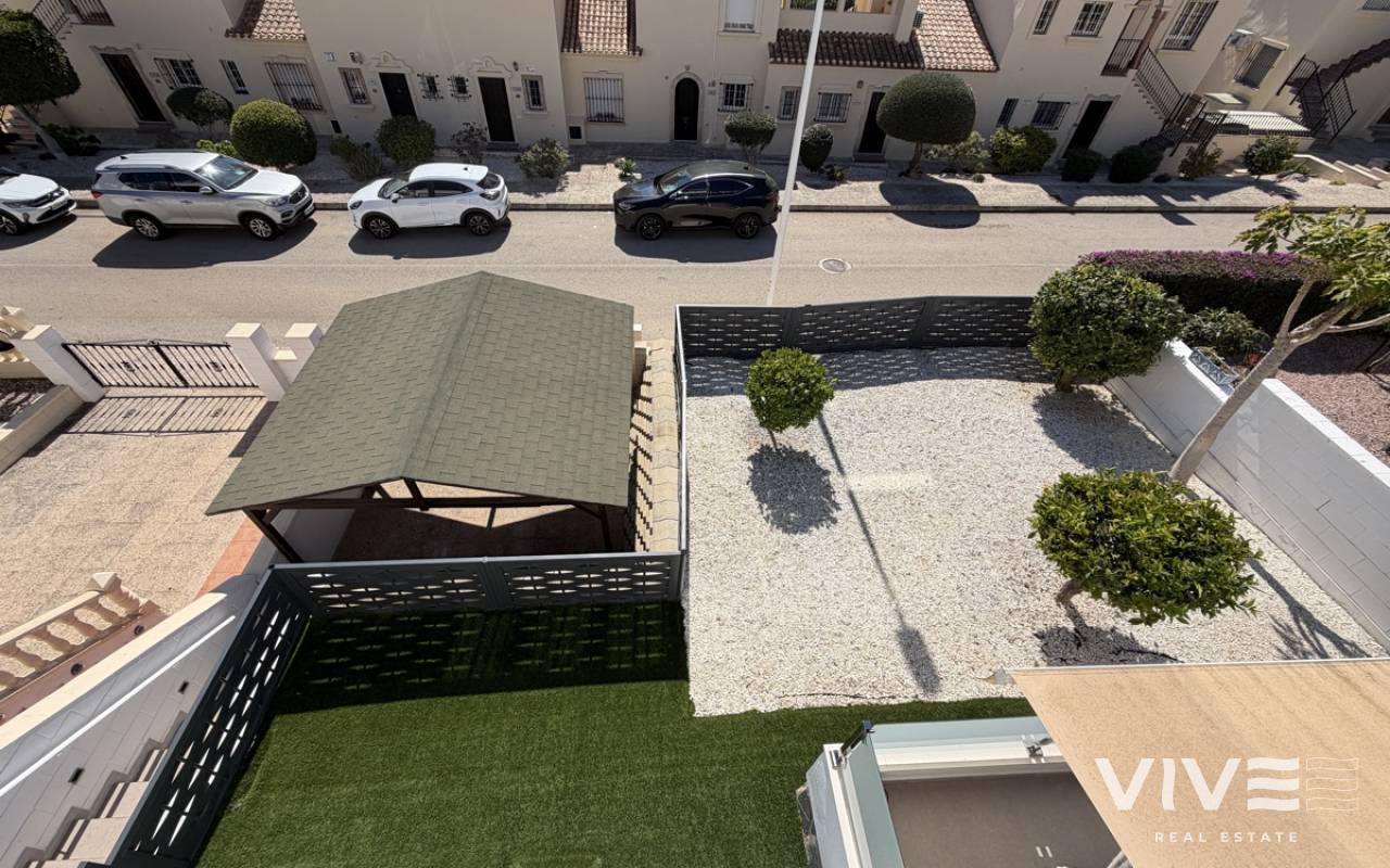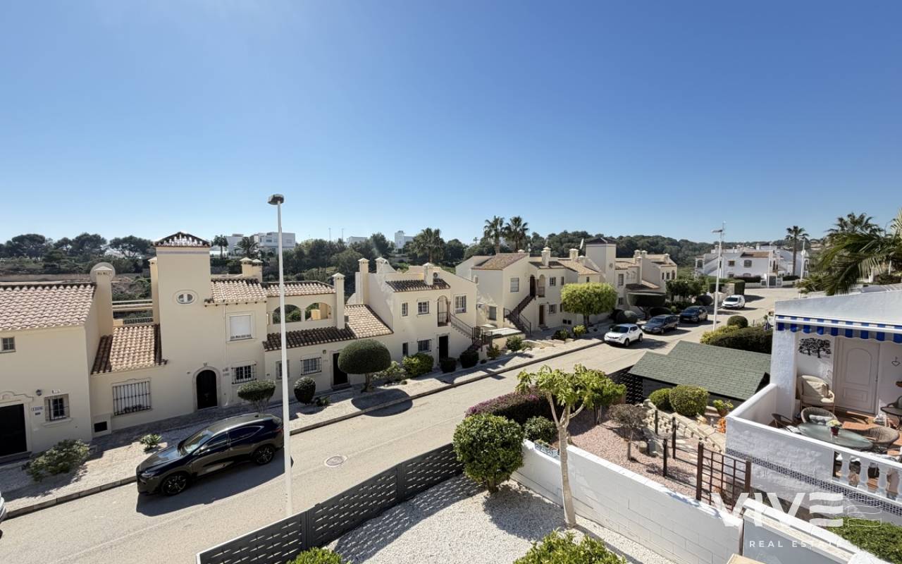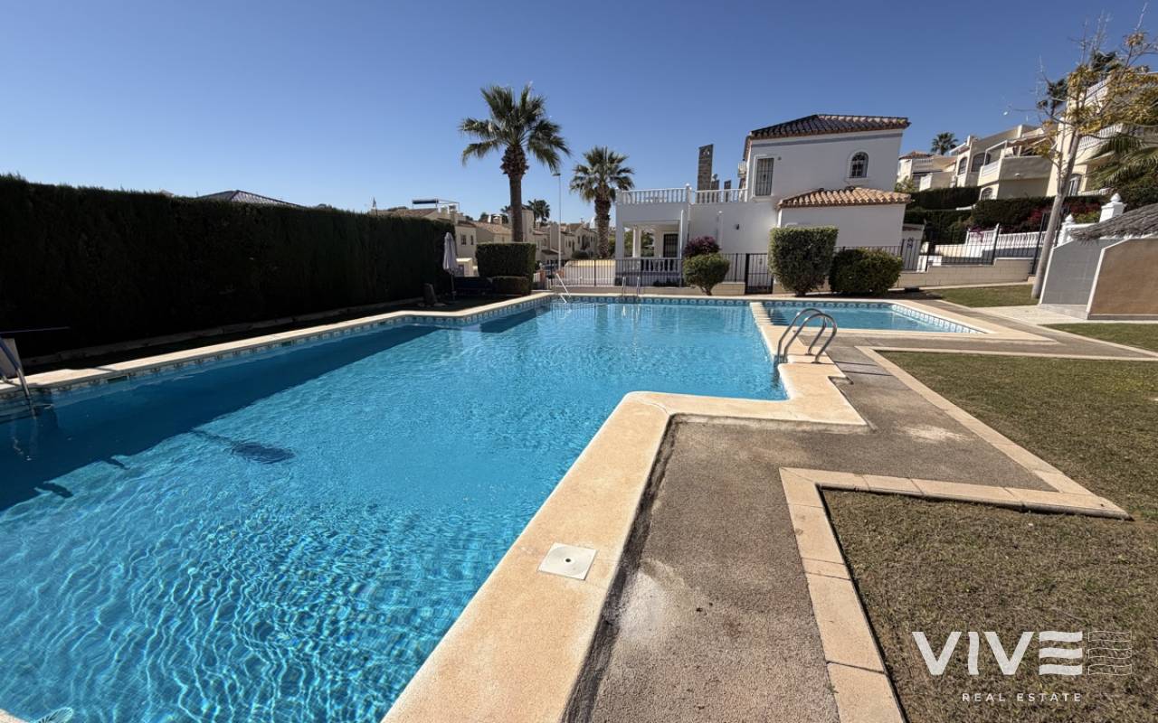 Beautifully presented three-bedroom, two-bathroom detached villa located in the highly sought-after area of Los Dolses on the stunning Orihuela Costa. Finished to an exceptional show home standard, this impressive villa offers bright, spacious, and versatile living throughout. The welcoming lounge area seamlessly connects to the third bedroom, currently utilised as an elegant dining space, providing flexibility to suit your lifestyle. The separate modern kitchen is both stylish and practical, fully equipped with a double oven, integrated microwave, and a built-in coffee machine station — perfect for contemporary living and entertaining. The ground floor also features a generously sized guest bedroom with fitted wardrobes and a beautifully presented modern family bathroom finished to a high specification. Upstairs, the impressive master suite offers a sleek en-suite bathroom, sun room with folding glass curtains, and walk-in wardrobe. From here, you step out onto a large south-facing sun terrace complete with dedicated sun lounging space and a private Jacuzzi area — an ideal setting for relaxing or entertaining while enjoying the Mediterranean climate. Set on an elevated plot, the property benefits from covered off-road parking with a carport (with electric gates) and offers the option to install a private swimming pool, if desired. The spacious rear garden provides additional outdoor enjoyment, including a storage shed and a shaded seating area. This superb villa is offered part furnished to an excellent standard and further benefits from mains gas central heating, full air conditioning throughout, electric shutters on the upper level, and electric toldos for additional comfort and convenience. An idyllic small community of 22 villas which share a lovely quiet communal pool area. An exceptional opportunity to acquire a stylish, move-in-ready home in a prime coastal location.