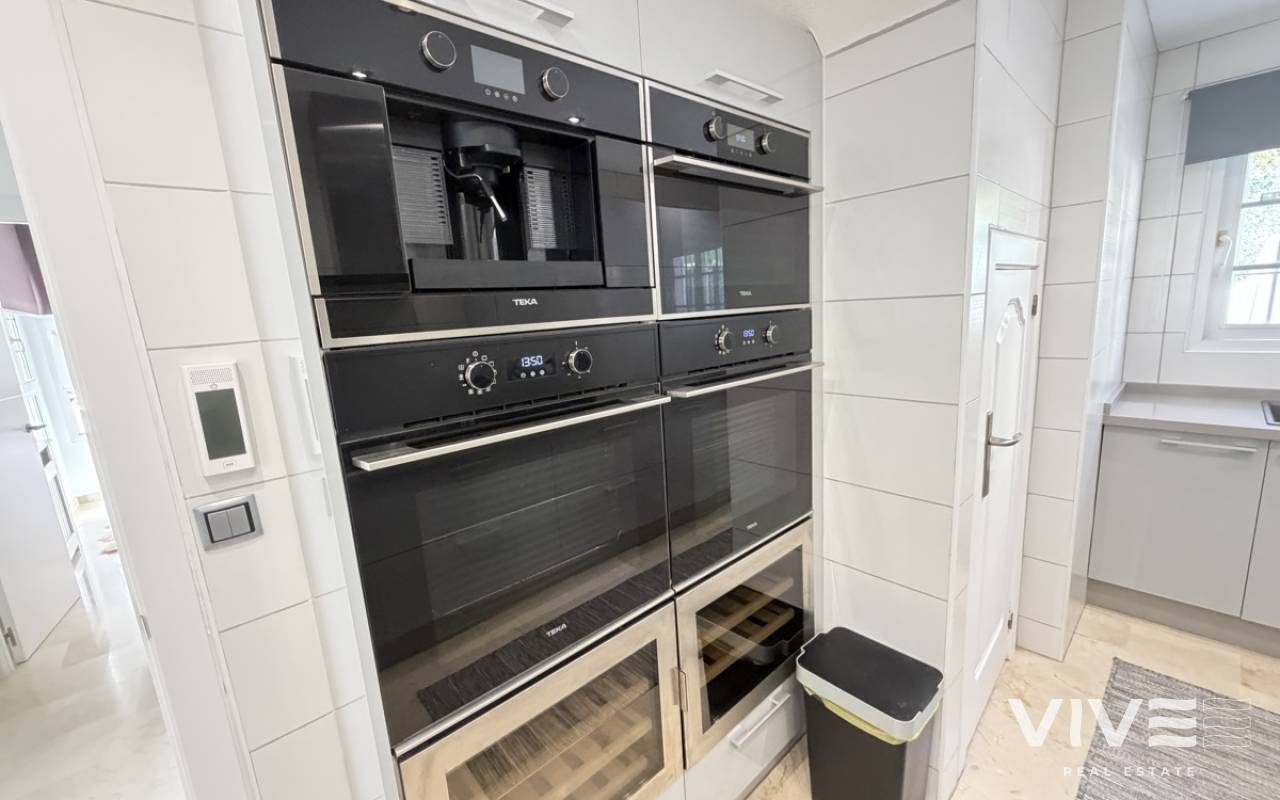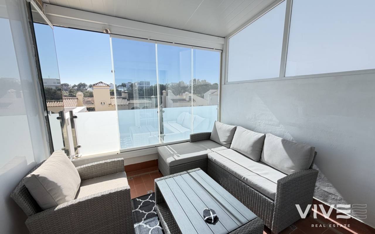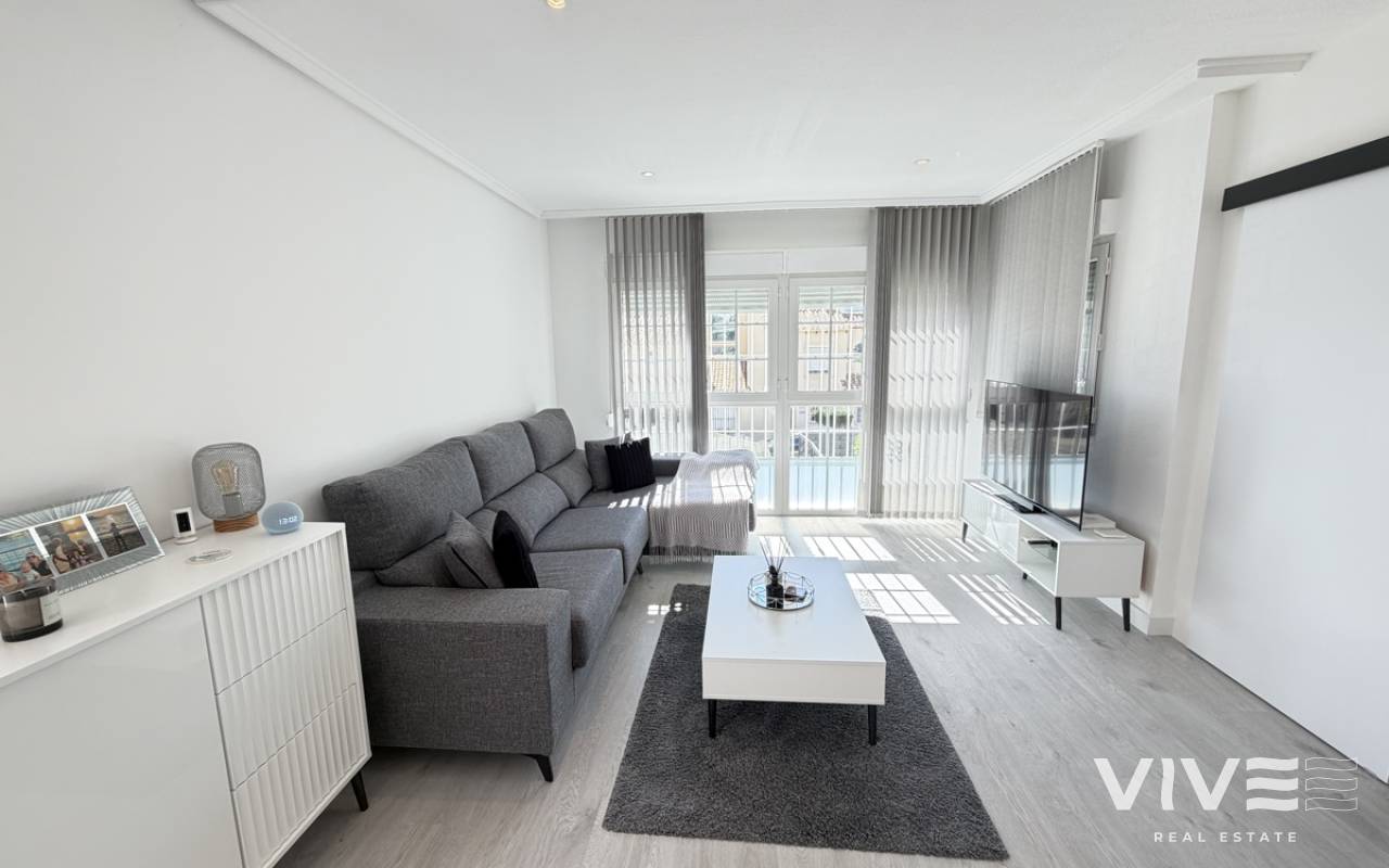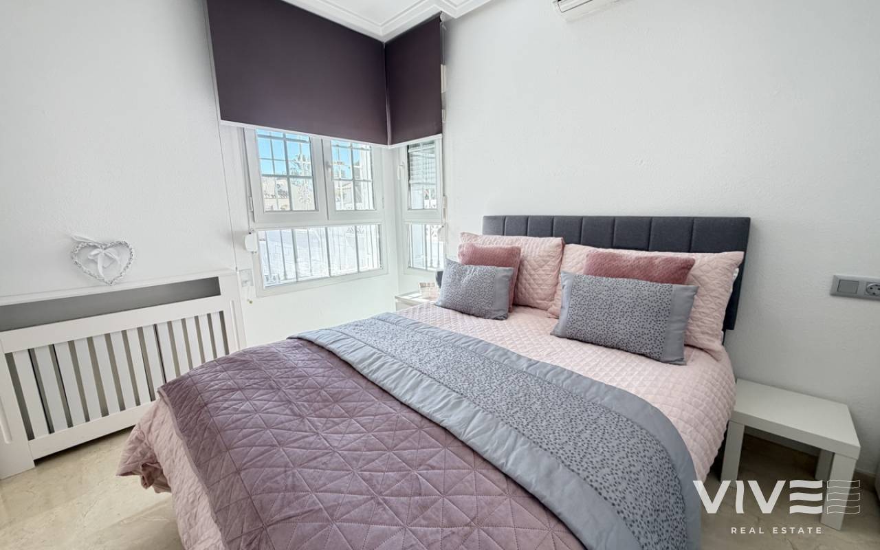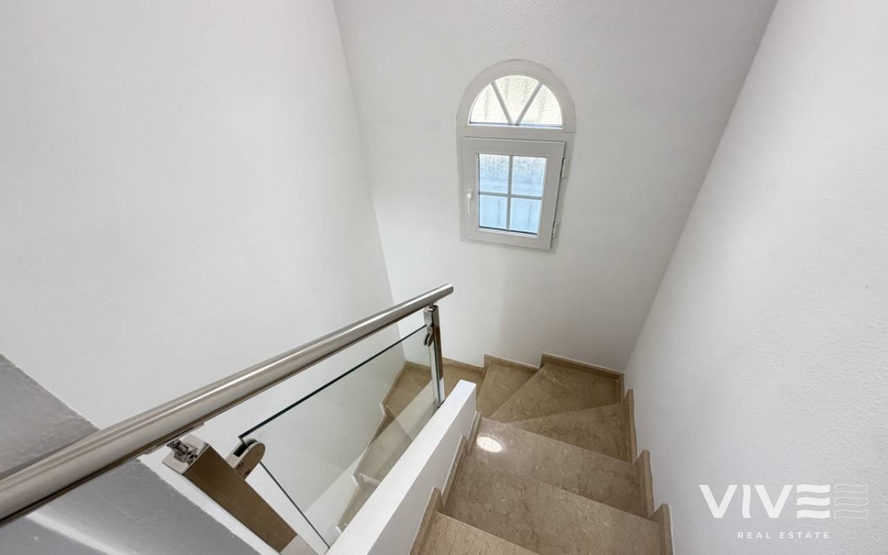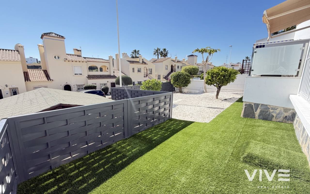 Beautifully presented three-bedroom, two-bathroom detached villa located in the highly sought-after area of Los Dolses on the stunning Orihuela Costa. Finished to an exceptional show home standard, this impressive villa offers bright, spacious, and versatile living throughout. The welcoming lounge area seamlessly connects to the third bedroom, currently utilised as an elegant dining space, providing flexibility to suit your lifestyle. The separate modern kitchen is both stylish and practical, fully equipped with a double oven, integrated microwave, and a built-in coffee machine station — perfect for contemporary living and entertaining. The ground floor also features a generously sized guest bedroom with fitted wardrobes and a beautifully presented modern family bathroom finished to a high specification. Upstairs, the impressive master suite offers a sleek en-suite bathroom, sun room with folding glass curtains, and walk-in wardrobe. From here, you step out onto a large south-facing sun terrace complete with dedicated sun lounging space and a private Jacuzzi area — an ideal setting for relaxing or entertaining while enjoying the Mediterranean climate. Set on an elevated plot, the property benefits from covered off-road parking with a carport (with electric gates) and offers the option to install a private swimming pool, if desired. The spacious rear garden provides additional outdoor enjoyment, including a storage shed and a shaded seating area. This superb villa is offered part furnished to an excellent standard and further benefits from mains gas central heating, full air conditioning throughout, electric shutters on the upper level, and electric toldos for additional comfort and convenience. An idyllic small community of 22 villas which share a lovely quiet communal pool area. An exceptional opportunity to acquire a stylish, move-in-ready home in a prime coastal location.