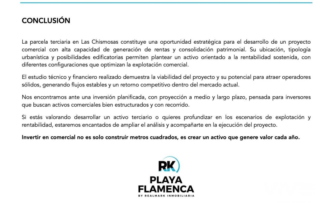 ENGLISH (British English). Tertiary Plot in Las Chismosas – Commercial Project with 7.49% Annual Gross Yield. . We present a strategic investment opportunity in urban tertiary land located on Calle Gorrión, Las Chismosas (Orihuela Costa), a well-established residential area with a high density of both permanent and international residents, ideal for commercial development.. . The plot measures 1,206.96 sqm, with a buildable area of up to 587 sqm, intended for the development of three commercial units with the option of a basement level, suitable for office use, academy, restaurant or other uses compatible with tertiary zoning.. . Key Project Features. . Urban classification: Urban land – Tertiary. Buildability: 587 sqm. Planned development: 3 commercial units. . Unit A: 80 sqm. Unit B: 170 sqm. Unit C: 250 sqm. . Preliminary design, technical layout studies and 3D visualisation included in the feasibility analysis.. . Financial Study and Profitability. . Estimated total investment: €1,090,000*. . Plot: €250,000. Construction cost: €770,800. Technical project: €45,000. Licences: €28,000. . Estimated rental income:. €6,800/month. €81,600/year. . Estimated gross annual yield: 7.49%. Estimated payback period: between 13 and 14 years. . (*Taxes not included). . Strategic Approach. . This project is conceived not merely as a development, but as the creation of a commercial investment asset designed to generate recurring cash flow, with medium- and long-term capital appreciation potential.. . Its location within a consolidated residential area, close to main access routes and services, supports the attraction of stable operators and medium- to long-term lease agreements, reducing volatility and strengthening the asset’s structure.. . Investment Opportunity. . This is a structured investment, supported by prior urban planning, technical and financial analysis, aimed at investors seeking:. . Well-dimensioned commercial assets. Returns above traditional investment products. Recurring income generation. Asset consolidation on the Costa Blanca. . If you are considering developing a tertiary asset in Orihuela Costa or would like further information regarding financial scenarios, tax optimisation or operational strategy, we would be pleased to assist you throughout the entire process.. . Investing in commercial property is not simply about building square metres, but about designing an asset that generates value year after year.. . Price: €250,000. Taxes and purchase costs not included (in accordance with applicable regulations). Agency fees for the buyer are included in the asking price. A detailed breakdown of additional costs will be provided prior to reservation.