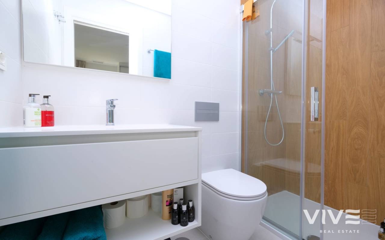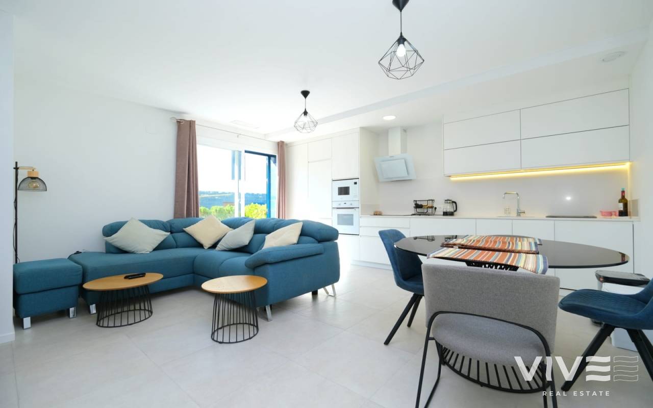 This beautifully presented two-bedroom, two-bathroom ground floor apartment boasts an enviable location just a short stroll from a superb selection of amenities, including the renowned Zenia Boulevard, stunning Blue Flag beaches, and the ever-popular Saturday market. Situated within a secure and impeccably maintained gated community, the property offers bright, stylish, and comfortable living throughout. The spacious lounge and dining area opens directly onto a sunny south-facing terrace — an ideal setting for relaxing or enjoying al fresco dining year-round. The contemporary fully fitted kitchen provides generous storage and ample workspace. The accommodation comprises a large master bedroom with en-suite bathroom, a second double bedroom, and a separate family bathroom, making the layout both practical and appealing. Further benefits include ducted hot and cold air conditioning, an electric awning, a water filtration system, secure underground parking, and access to beautifully landscaped communal gardens with a swimming pool and dedicated children’s play area. The apartment is offered partially furnished, making it ready to enjoy from day one.