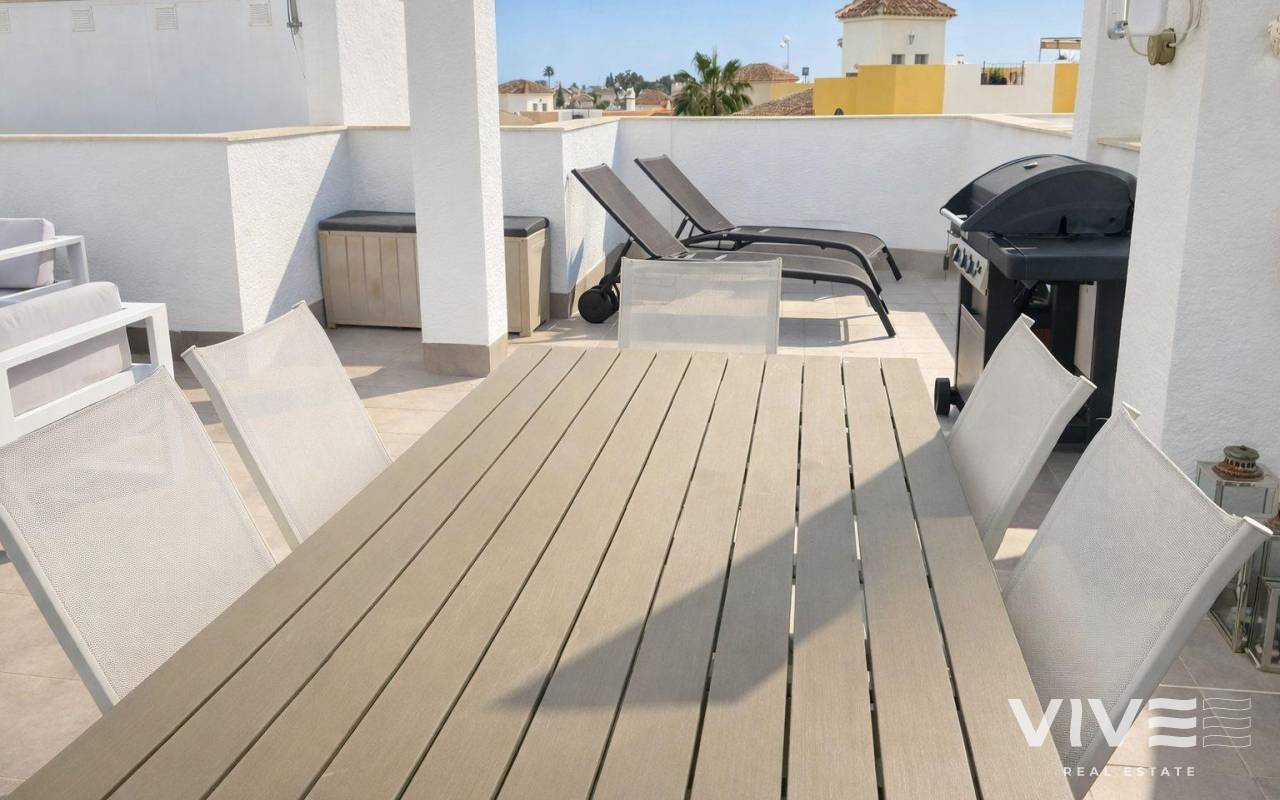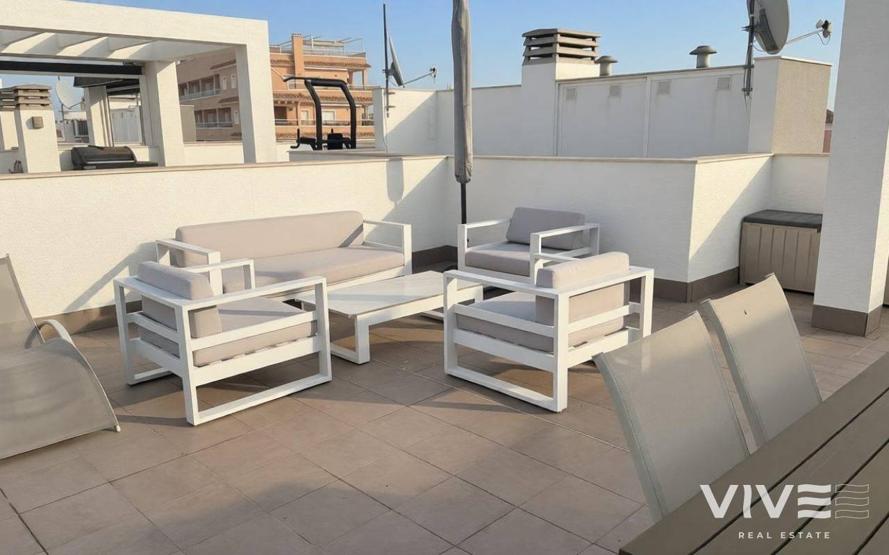 Exclusive furnished penthouse in the prestigious Oasis Beach 7 residence, Torrevieja. A modern 66 m2 property designed for comfort, ideal as a high-yield investment or holiday home.. . Layout: 2 bedrooms (one en-suite), 2 full bathrooms, and a bright living room with an open-plan kitchen.. . Outdoor Spaces: Terrace overlooking the pool and a spectacular 58 m2 private solarium.. . Features: Sold fully furnished and equipped (appliances, AC, motorized shutters, and LED lighting). Includes underground parking.. . Luxury Complex: Gated community with extensive green areas and a resort-style pool.. . Location: Just 1,500 m from the beach and 5 minutes from Zenia Boulevard. Ready to move in!
