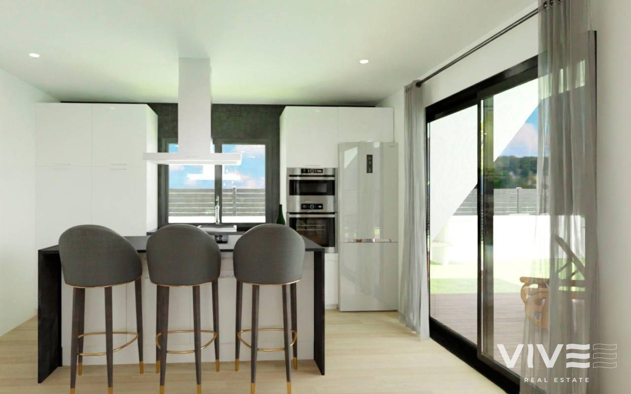 NEWLY BUILT VILLAS WITH POOL IN HONDON DE LAS NIEVES Discover the elegance and comfort of these beautiful detached villas ranging from 108 to 128 m2, designed to offer you an exceptional lifestyle, all on one floor. Enjoy the privacy offered by this villa, where you can relax in your own garden, create an oasis of tranquillity, or cool off in your private pool to enjoy the warm summer days. The property is distributed into two large areas: Day area: Here we find a spacious living-dining room with an open-plan kitchen (kitchen furniture included) that connects to the large modern porch through two large windows, leading to the landscaped outdoor area and the pool. As an extra space, there is a laundry area strategically located in the layout of the house, which is easily accessible from anywhere in the property. Rest area: In this area there are 3 bedrooms. The master bedroom has a large dressing room and en-suite bathroom. There is also a second bathroom for the other bedrooms and the rest of the house. Located in a quiet, residential area, this villa allows you to enjoy the privacy and tranquillity you desire, while being within easy reach of amenities, shops, supermarkets and restaurants. It is the perfect balance between peaceful seclusion and the comforts of modern living. In this development in Hondón de las Nieves, every day is an opportunity to connect with the world. Hondón de las Nieves is a municipality in the Valencian Community, Spain. It is located in the south-west of the province of Alicante, in the Vinalopó Medio region. The beaches and Alicante airport are very close by, only 30 minutes away by car.