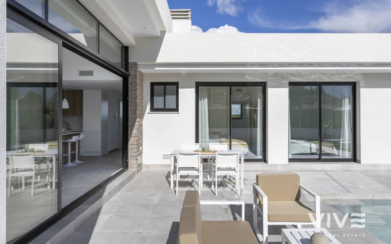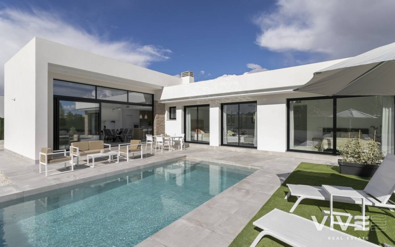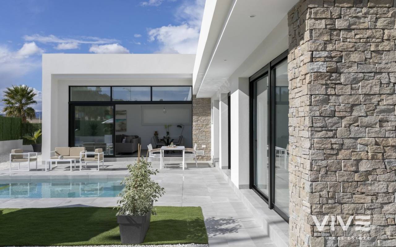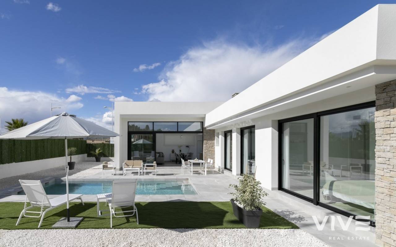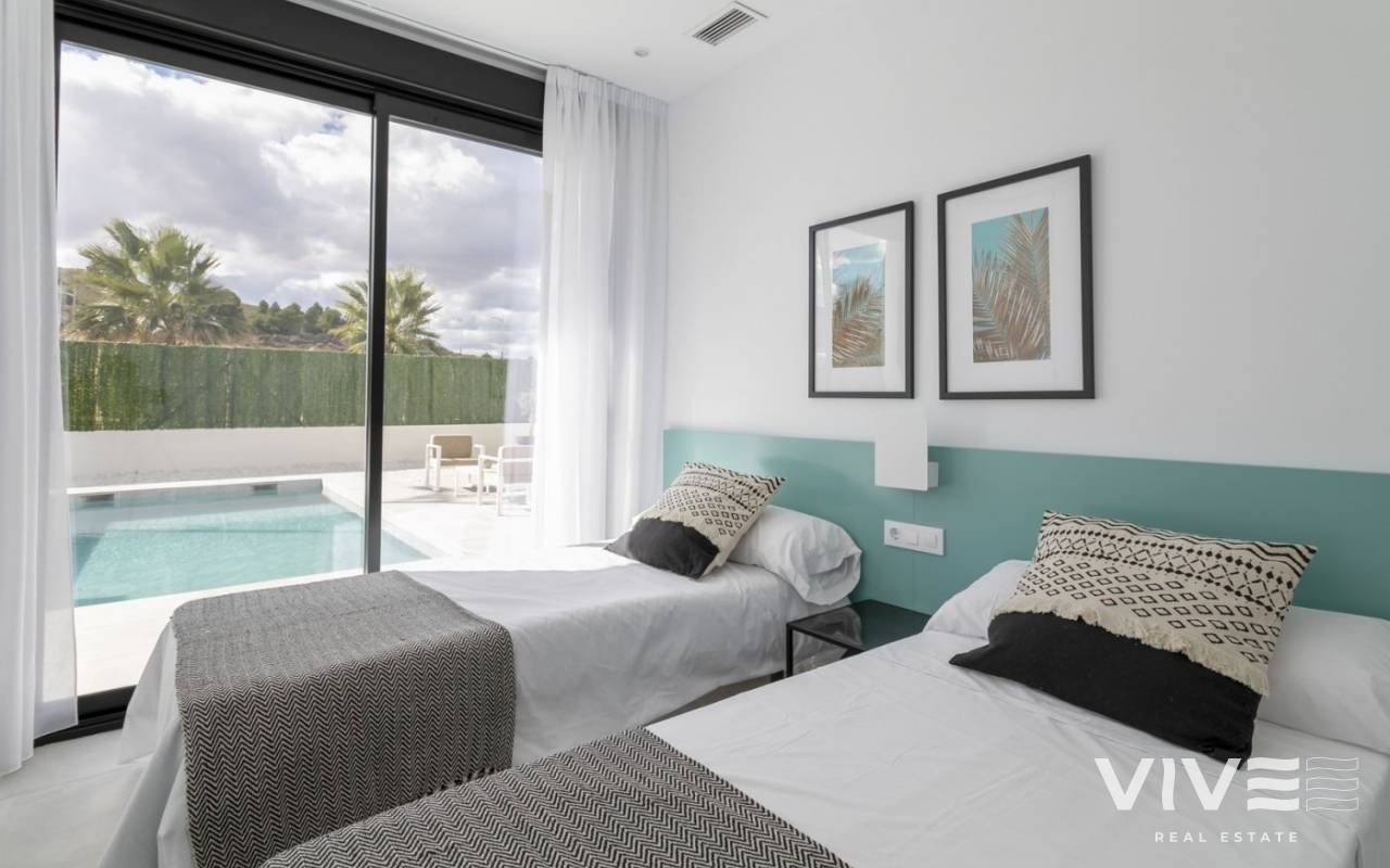 MODERN VILLAS IN CALASPARRA WITH PRIVATE POOL !!! New real estate development consisting of 215 independent villas in Calasparra. 170 villas will be built on plots of 545 m² and 45 villas on plots of 1,250 m². 2 and 3 bedroom homes with a private pool of 24.5 m2 included, modern finishes and maximum qualities: Matt black aluminum windows, motorized blinds, armored entrance door to the house, white lacquered interior doors, aerothermal system for hot water production, quartz (silestone) countertop in kitchen, electrical appliances included, pre-installation of air conditioning by ducts.