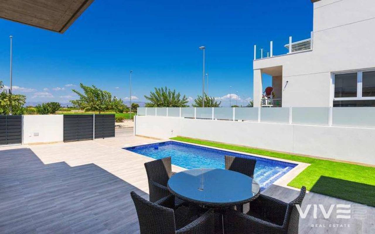 THE MEDITERRANEAN LIFESTYLE ALL ON ONE LEVEL The village of Daya Nueva is the perfect combination of a peaceful and comfortable rural lifestyle and the vibrant coastal areas of the Costa Blanca, just a short drive away. This development of semi-detached and detached new-build villas has been designed with great attention to detail and built to a high standard. All villas will have their own private pool. YOUR OWN SPACE TO LIVE, ALL ON ONE LEVEL A bright, fresh and modern approach has been incorporated into the design. Located in a small village in the south of the province of Alicante. The village is called Daya Nueva. Newly built single-storey villas in the new part of Daya Nueva. Just a few minutes' walk from the village centre. The property consists of 3 bedrooms, 2 bathrooms and a private 18m2 swimming pool. Living/dining room with double-height ceiling, open kitchen, natural light and option for a solarium at an extra cost. The master bedroom has the option of a walk-in wardrobe and en-suite bathroom. Located in a new and quiet residential area, about 10 minutes from the beach of La Marina del Pinet and Guardamar del Segura. Easy access to the A-70 motorway and approximately 25 minutes from Alicante International Airport.