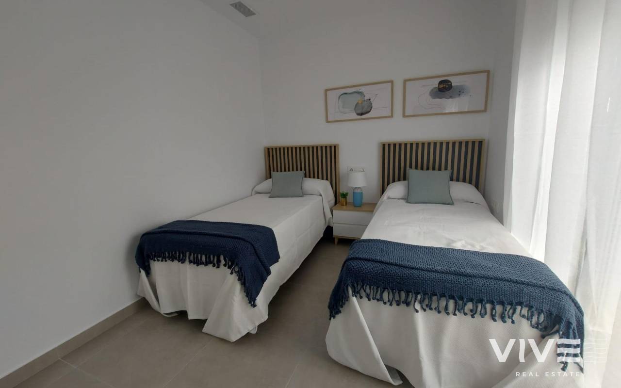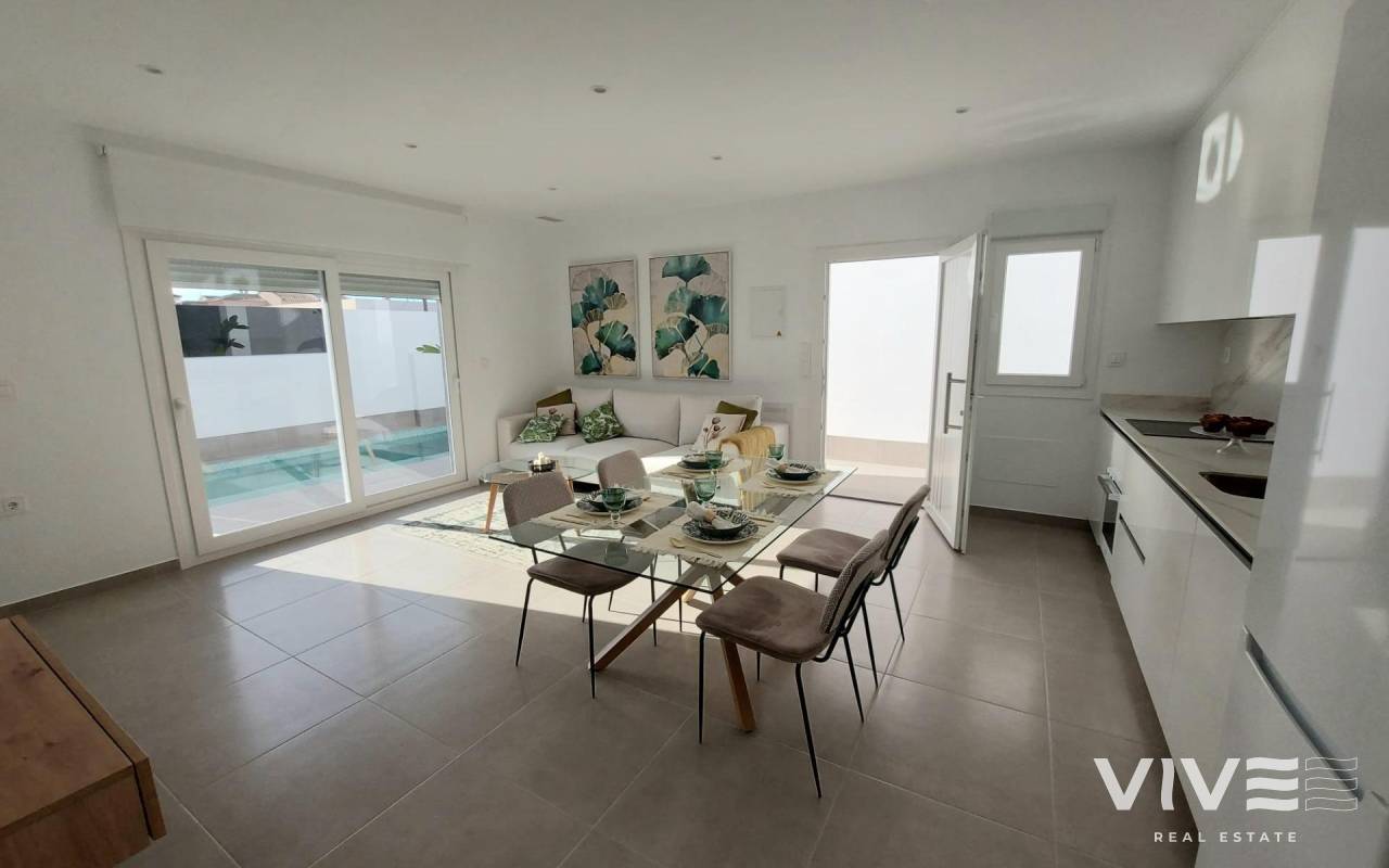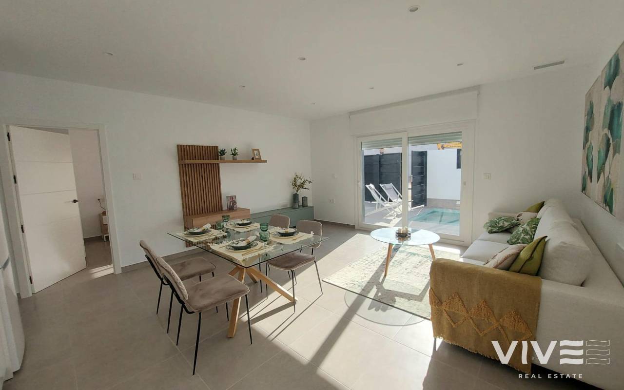 NEW BUILD SEMI-DETACHED VILLAS IN ROLDAN New Build semi-detached villas in Roldan, Torre Pacheco. Modern villas build over one floor, has 2 or 3 bedrooms, 2 bathrooms, open plan kitchen with the lounge area, fitted wardrobes, private solarium. All villas has private garden with pool and parking space. Roldan itself is a traditional town with all the local amenities you will need including Supermarkets, Restaurants, Bars, Health Clinic, Pharmacy, Police Station, Petrol Station, Mechanics, Dentists, Doctors and more. The nearby golf resorts of La Torre, & Terrazas are easily accessible, Corvera Airport is 15 minutes away & the beaches of the Mar Menor just 20 minutes drive.