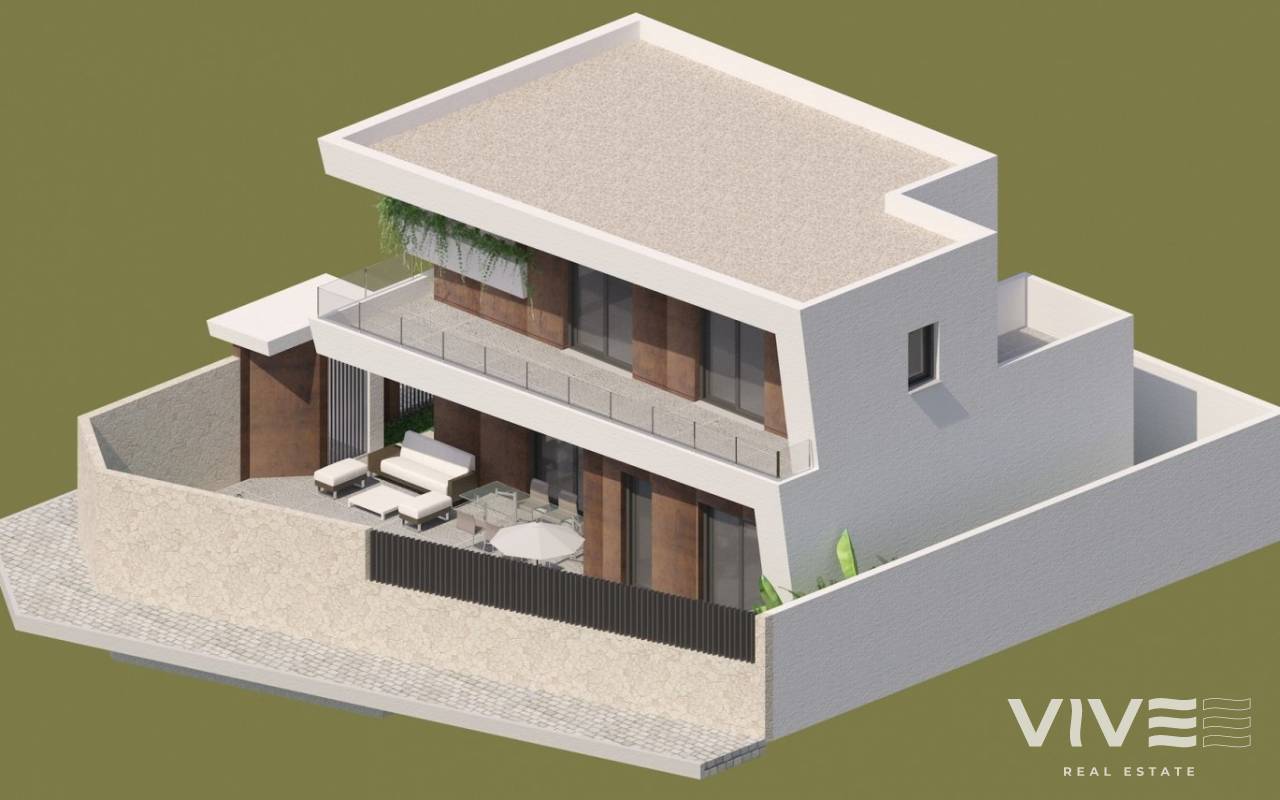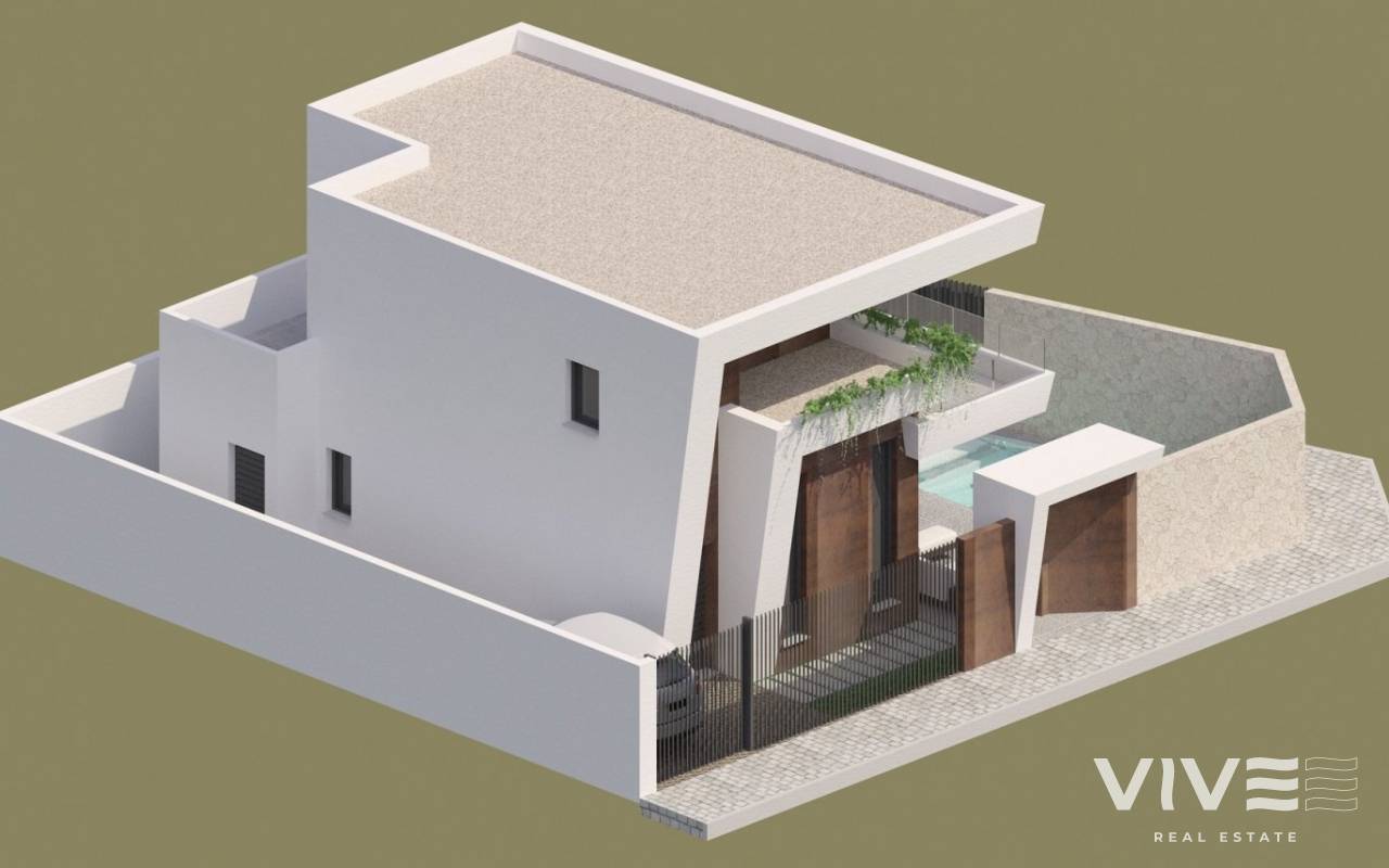 NEW BUILD MODERN VILLAS IN BENIJOFAR New Build villas located in Benijófar, a privileged area of the Costa Blanca, equipped with all services, 20 minutes from Alicante Airport, near the beautiful beaches of Guardamar and several golf courses. It is a modern style villas consisting of spacious living-dining room with an open-plan kitchen, 3 bedrooms( one of them en-suite) and 4 bathrooms. It also has a private plot with terrace, parking area, private pool, Mediterranean-style garden with great views. The house also has hot and cold air conditioning, video intercom and security door. Benijofar it is a lovely village with a charming church and all services such as supermarkets, pharmacies, banks, restaurants and natural park located very close to the villas. There are several golf courses close by as well as water parks in nearby Rojales and Torrevieja. Benijófar located a few minutes from the N-332 and AP-7. Just 30 minutes from Alicante airport, 10 minutes from the beaches of Guardamar and Torrevieja.