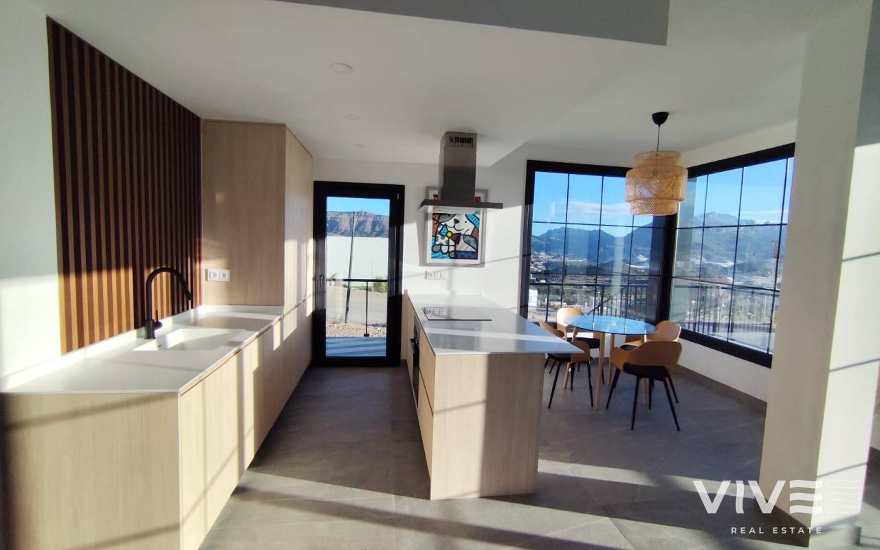 NEW BUILD SEMI-DETACHED VILLAS IN POLOP New Build modern semi-detached villas with several terraces and solarium, totally fenced, with parking area for vehicles and private swimming pool in Polop. Modern properties with 3 spacious bedrooms with built-in wardrobes (the main one on the ground floor, with bathroom and dressing room en suite), 2 spacious bathrooms, large living-dining room with open kitchen, spacious terraces. Kitchen equipped with base units and silestone worktops, with ceramic hob, oven, extractor hood, fridge, washing machine, dishwasher, and aerothermal heater. First qualities: interior carpentry in wood and white lacquered laminates, exterior carpentry in anthracite grey pvc with double glazing and thermal bridge break, and automatic blinds with aluminium slats, ceramic floors of 1st quality non-slip, smooth walls, security door with 5 anchor points, large built-in wardrobes. The city of Polop offers an amazing range of options for lovers of the great outdoors surrounded by nature and unparalleled peace. The municipality enjoys a Mediterranean climate with cooler temperatures and cleaner air, located less than 10 kilometres from Benidorm, Altea and their beaches. It stretches from the rivers Guadalest and Algar to the town of Villajoyosa, including the beaches of Albir and Benidorm; inland it borders Callosa and Guadalest.