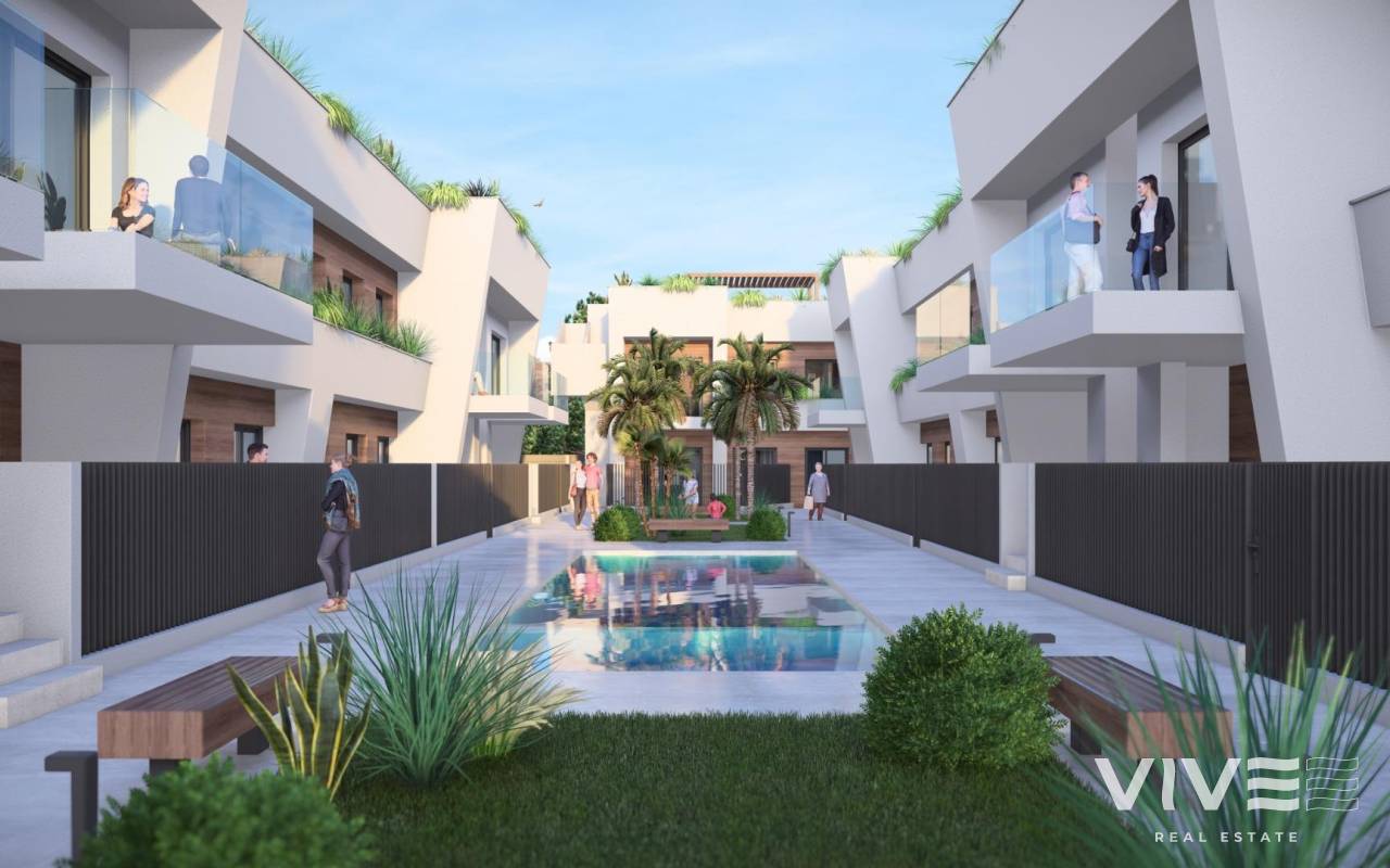 New Construction Homes in Torre-Pacheco, Costa Cálida Modern Bungalows with Exceptional Features Discover a new residential complex in Torre-Pacheco, offering 24 stylish bungalows with 2 or 3 bedrooms. Choose between ground-floor homes with spacious terraces or first-floor units boasting private terraces and solariums. Each solarium includes a pergola, a barbecue area, and reinforced roofing, perfect for installing a jacuzzi. All homes come with a designated parking space and fully installed air conditioning, ensuring comfort year-round. Prime Location in Torre-Pacheco Nestled in the heart of Torre-Pacheco, this development enjoys proximity to essential amenities, including supermarkets, shops, bars, and restaurants. The vibrant town center, with its charming Spanish ambiance, is within walking distance. For beach lovers, the stunning Mar Menor is just a 10-minute drive away, offering golden sands and crystal-clear waters. Enjoy Outstanding Community Amenities The complex features a beautifully landscaped community area with lush gardens and a sparkling pool, providing a serene retreat to relax and unwind. The area’s sunny climate, averaging 320 days of sunshine annually, complements these outdoor spaces perfectly. Surrounded by Award-Winning Golf Courses Torre-Pacheco is a golfer’s paradise, surrounded by some of the most renowned golf courses in Spain. These courses are just a short drive away, making it an ideal location for golf enthusiasts. Strategic Connections to Key Destinations Murcia International Airport: 20 km (approximately 20 minutes by car). Train Station: Only 700 meters away, offering convenient travel options. Shopping Centers: Several large shopping complexes within a 15 km radius. Beaches: The beautiful Costa Cálida beaches are a mere 10 km away. Ports and Marinas: The closest marina is around 12 km away, perfect for boating and water sports. A Healthier Lifestyle Awaits The Costa Cálida region is renowned for its exceptional quality of life. With low humidity, clean air, and a subtropical climate, this area is one of the healthiest in Spain. The perfect combination of natural beauty, sea breezes, and abundant sunlight makes Torre-Pacheco a highly sought-after destination. Act Now to Secure Your Dream Home Don’t miss this opportunity to own a modern home in a prime location. Contact us today to learn more about this incredible development or to schedule a viewing!