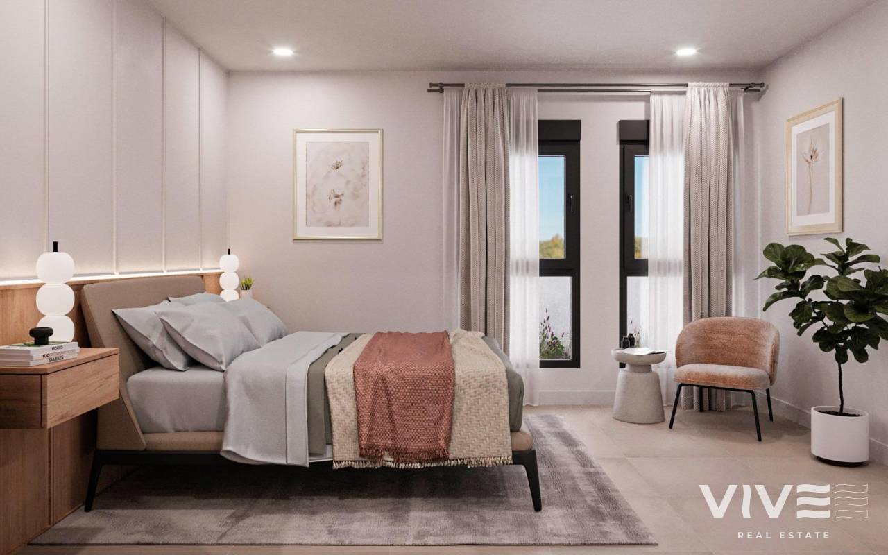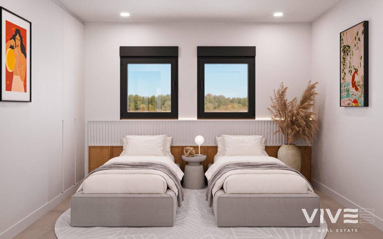 Newly built residential development of villas and townhouses in Fuente Álamo, Murcia. This location offers an exceptional natural environment, far from the hustle and bustle of big cities and the tourist pressure of the coast. Furthermore, we are committed to working from a sustainable development perspective, minimising our environmental impact and maximising integration with the local community. Here, your dreams of a peaceful and sustainable lifestyle become a reality. Imagine waking up every morning in a stunning natural setting, surrounded by peaceful landscapes and the unique beauty of the Murcian countryside. This development prioritises energy efficiency, the use of environmentally friendly materials and harmonious integration with the rural environment. From the design of the property to the planning of the development, we strive to reduce our carbon footprint and promote responsible practices in all our operations. Full ducted air conditioning, hot/cold. Video intercom system. Colour-lacquered security access door with lock and anti-vandal security fittings. Cupboards with storage space, lined inside, lacquered in white. Kitchen furniture with appliances included. Hot water by aerothermal energy. Electric blinds. Pergolas in solariums. Private 2.5x4.5m swimming pool with underwater night lighting and salt chlorination system. Pre-installation for outdoor kitchen/jacuzzi in solarium. Fuente Álamo de Murcia is a town and municipality in the Region of Murcia, in southern Spain. It is located 22 km northwest of Cartagena and 35 km southwest of Murcia. The town is located in the Mar Menor basin, surrounded by the Algarrobo, Los Gómez, Los Victorias and Carrascoy mountain ranges. The water from these mountains flows down into the Rambla de Fuente Álamo and then into the Mar Menor. Fuente Álamo is 30 minutes from Murcia - Corvera airport. Nearest shops 6 km away.
