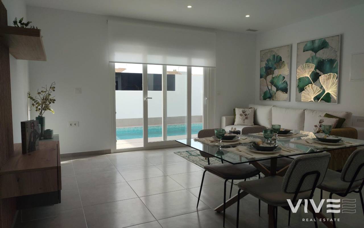NEW BUILD ONE LEVEL VILLAS IN BALSICAS, MURCIA New Build residential has 6 one level detached villas, with terraced area, private pool, parking on the plot and solarium with Summer kitchen, to enjoy all hours of sunshine every day of the year. Each property has 3 bedrooms and 2 fitted bathrooms. The property has been designed with a contemporary style and an open planned concept, with a fully-fitted kitchen and lounge-dining room. The property will meet the highest standards and will be equipped with: Kitchen completely furnished and equipped with oven, integrated fridge and dishwasher, hob and extractor fan. Kitchen island work zone. Lighting: inside the property (dining room, kitchen, corridors and bathrooms), and as well as in outdoor areas. Lined wardrobes with drawers. Fully fitted bathrooms with toilet, vanity unit, mirror and shower with screen panels. Pre-installation for ducted air conditioning. Solarium with Summer kitchen, with pre-installation for appliances and sliding doors. Private pool with external shower. Parking space on the plot. Balsicas is a perfect place for golf lovers and also for anyone who enjoys green spaces as places of leisure, beauty and tranquillity. Its strategic location makes it possible for the family that decides to live in this complex to have at their fingertips everything that anyone could wish for: a climate where the sun shines almost all year round, nearby beaches, the Mar Menor and its natural muds. with proven healing powers. Complex located 20 minutes from Murcia - Corvera airport and 1 hour from Alicante airport.