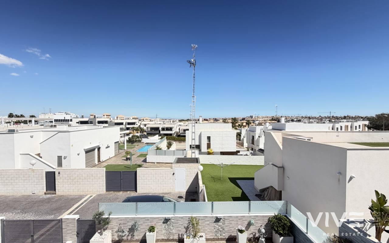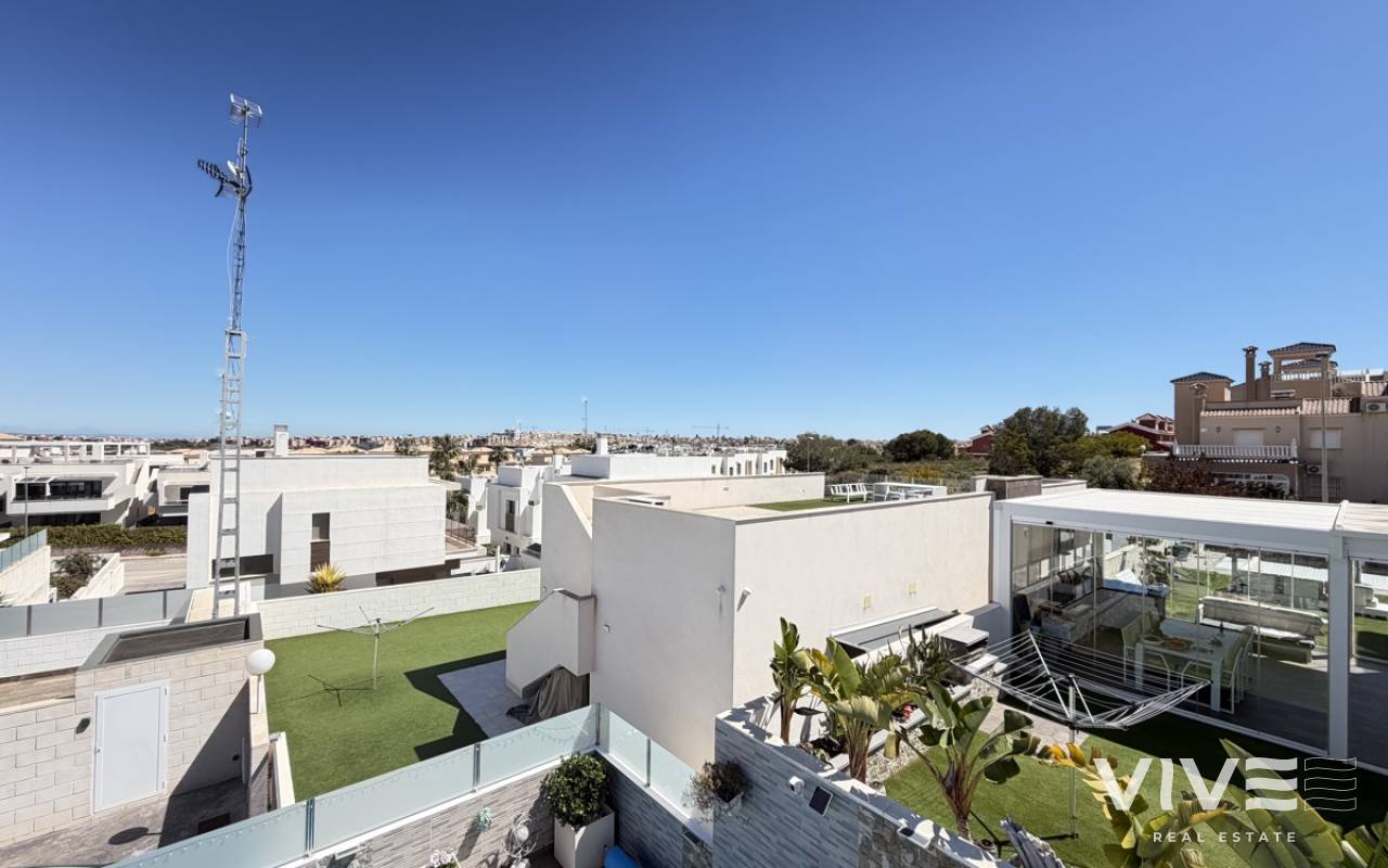 Stunning 3-Bedroom Single-Storey Villa in Pau 26, Villamartin This splendid three-bedroom, single-storey villa is ideally situated in the sought-after Pau 26 area of Villamartin. Positioned on a desirable corner plot along a private road, the property offers both privacy and generous outdoor living space. The exterior boasts a spacious garden with multiple seating areas, a private swimming pool, and off-road parking. A standout feature is the expansive rooftop solarium, complete with a jacuzzi and outdoor kitchen—perfect for entertaining while enjoying panoramic views of the surrounding area. Inside, the villa features a bright and modern open-plan living space with a large, well-appointed kitchen. There are three generously sized double bedrooms, including a master bedroom with en-suite bathroom, as well as a separate, spacious family bathroom. Offered unfurnished, this property is ready for immediate occupancy—making it an ideal choice for a permanent residence, holiday home, or investment opportunity.