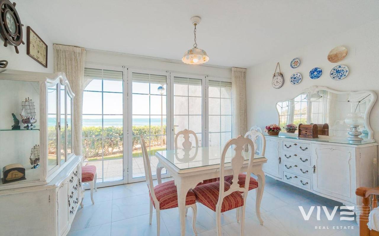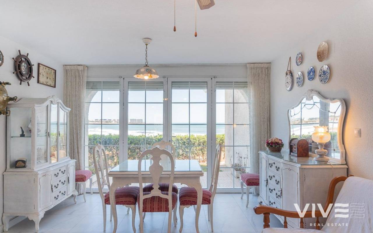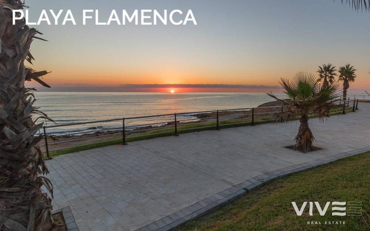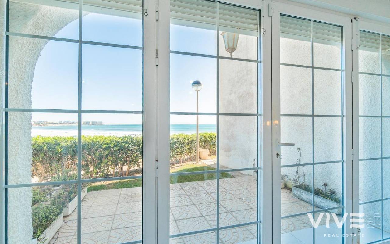 Discover a unique gem on the seafront in the prestigious area of Playa Flamenca, where properties rarely come onto the market due to its privileged cliffside location.. . This charming townhouse, with 90 m2 built, offers an unparalleled Mediterranean lifestyle. On the ground floor, you will find a spacious living room filled with natural light, featuring a large front window with direct access to the garden, where you can enjoy open views and the soothing sound of the sea. The kitchen is independent, practical, and perfectly suited for everyday living. At the entrance, there is also a cozy private garden that adds a welcoming touch.. . Upstairs, there are two spacious double bedrooms. The master bedroom is truly exceptional: imagine waking up and enjoying sea views directly from your bed. This floor also includes a fully equipped bathroom.. . The property is part of an exclusive residential complex with a communal swimming pool, perfect for enjoying the Mediterranean climate all year round. In this highly sought-after area, where properties are rarely available, this home represents a unique opportunity both as a permanent residence or an investment.. . Living here means embracing a seafront lifestyle in one of the most desirable locations in Orihuela Costa.. . A truly exceptional property where the sea becomes part of your home.. . Price: €390,000. Taxes and purchase costs not included (according to applicable regulations). A detailed breakdown of additional costs will be provided prior to reservation.