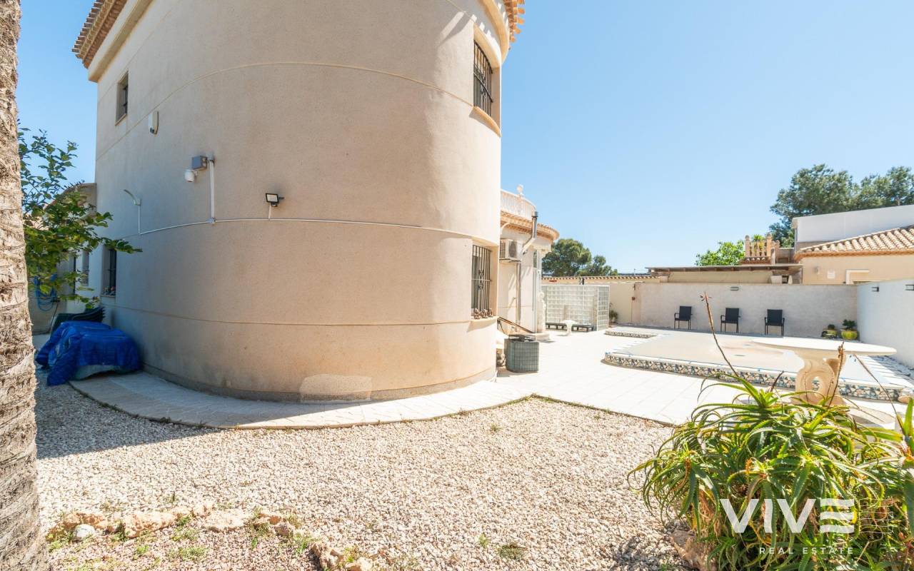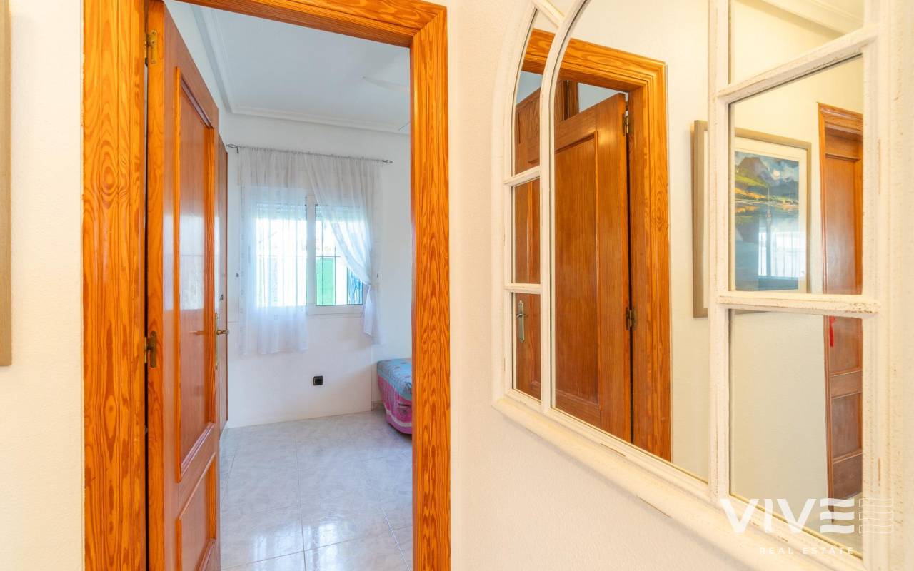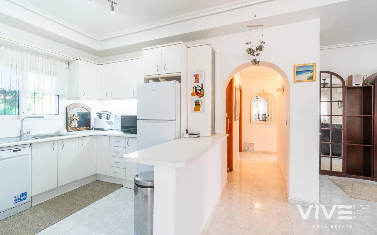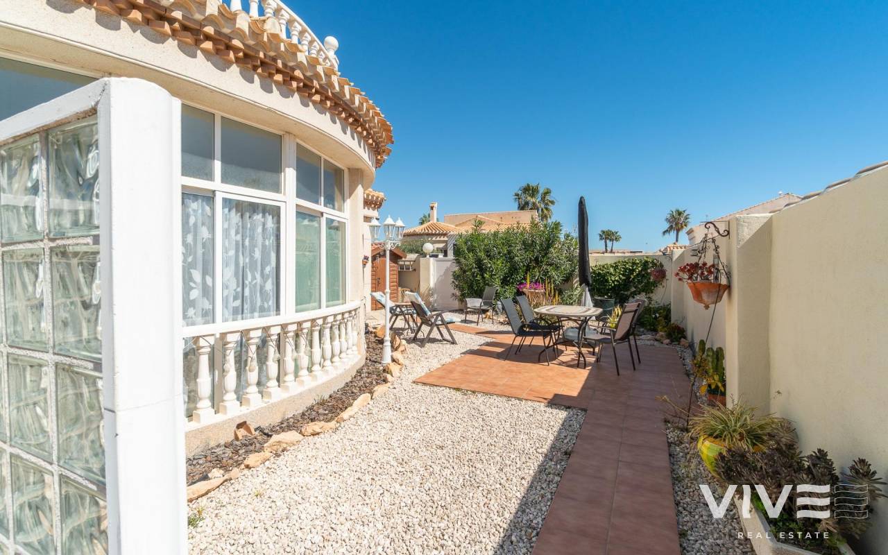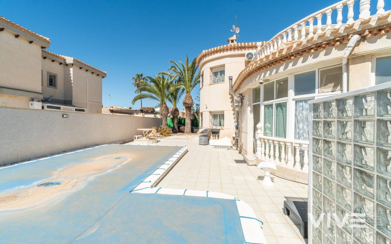 This large detached villa, situated on a 500 m2 plot with over 190 m2 of living space, is superbly located in the heart of Playa Flamenca. It is truly within walking distance of everything: supermarkets, municipal and private sports facilities, the Zenia Boulevard shopping center, a public school, the town hall, shops, doctors, and the beaches of Orihuela Costa.. . The Saturday market is very close, with direct walking access, allowing you to enjoy shopping for fruits, vegetables, and traditional products while experiencing the atmosphere of a small Spanish village. At the same time, you can easily access the property by car without encountering road closures.. . The 500 m2 plot, as mentioned, offers numerous possibilities for enjoying the outdoor space, including a swimming pool, barbecue, outdoor kitchen, solarium, pergolas, parking, and more. Maintenance is very easy, with terraces, artificial grass, and gravel areas, ensuring that keeping your garden and outdoor areas in perfect condition requires minimal effort.. . The property features on-site parking with automatic gates and a private garage/storage area to keep your vehicle protected from the Alicante sun. The pool area is perfect for sunbathing in privacy, while the built-in barbecue and wooden pergola allow you to fully utilize the plot's potential, thanks to its southern exposure and sun exposure throughout the day. This also ensures abundant natural light throughout the property's daytime living areas.. . There is a glazed solarium terrace at the entrance to the house, but with its traditional clay tile roof. In winter, when the sun is lower, it can be used for sunbathing, and in summer, by opening the glass windows and enjoying the shade of the roof, it becomes a cool and airy space where you can relax with a book and spend time with family in a semi-covered outdoor area. From this covered terrace with arches, you enter the main house with its large living-dining room, featuring a fireplace and south-facing windows for maximum natural light and sunshine, and a semi-independent kitchen with a breakfast bar and an adjacent utility room that combines pantry and laundry space.. On the same ground floor, the house has two spacious bedrooms with built-in wardrobes, a bathroom with a walk-in shower, and the staircase leading to the upper floor.. . Upstairs, you'll find the large master bedroom overlooking its own garden and swimming pool, a large bathroom with a walk-in shower, and a large glazed space perfect for a playroom, office, guest room, or any other use. This is complemented by the rest of the solarium, which offers sea views and a south-facing orientation, ensuring sunshine all day long.. . In short, this is a detached villa in a central and well-connected location, with outdoor areas for leisure and family enjoyment. It is in perfect condition and ready to move into, and a visit is well worth it to appreciate its excellent features.. . Price: €640,000. Taxes and closing costs not included (according to applicable regulations). A breakdown of additional costs will be provided before booking.. . In the case of a transaction with two intermediaries, the buyer's professional fees will be 1.5% of the final purchase price, with a minimum of €3,000, plus VAT (21%), unless expressly agreed otherwise. These fees are not included in the advertised price.