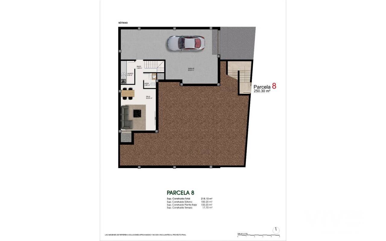 The villa is built on a plot of 250.30 m2 and has a total built area of 218.10 m2, distributed in a clear and functional way: